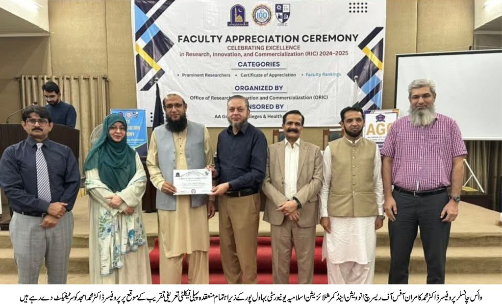 آفس آف ریسرچ انوویشن اینڈ کمرشلائزیشن اورک اسلامیہ یونیورسٹی بہاولپور نے اپنی پہلی فیکلٹی تعریفی کارکردگی تقریب کا انعقادکیا۔ تقریب ان فیکلٹی ممبران کے اعزاز میں منعقد کی گئی جنہوں نے ہائر ایجوکیشن کمیشن کے مطابق تحقیق اختراع اور کمرشلائزیشن کے شعبوں میں غیر معمولی کارکردگی کا مظاہرہ کیا۔ پروفیسر ڈاکٹر محمد کامران وائس چانسلراسلامیہ یونیورسٹی بہاولپور، پروفیسر ڈاکٹر شازیہ انجم وائس چانسلر دی گورنمنٹ صادق کالج ویمن یونیورسٹی بہاولپور اور پروفیسر ڈاکٹر مظہر ایاز وائس چانسلر چولستان یونیورسٹی آف ویٹرنری اینیمل سائنسز تقریب کے مہمانان خصوصی تھے۔ پروفیسر ڈاکٹر محمد کامران وائس چانسلر اسلامیہ یونیورسٹی بہاولپور نے اورک ٹیم اور فیکلٹی ممبران کی کاوشوں کو سراہتے ہوئے اس بات پر زور دیا کہ تحقیق اور اختراعات کا فروغ یونیورسٹی کے تعلیمی کارکردگی اور قومی ترقی کے مشن کے لیے اہم ہے۔انہوں نے تمام ایوارڈ وصول کنندگان کی لگن کو سراہا اور تحقیق اختراعات اور کمرشلائزیشن کے متحرک کلچر کو فروغ دینے کے لیے یونیورسٹی کے عزم کا اعادہ کیا۔ مہمانانِ اعزاز میں ڈاکٹر سجاد سرور، پلمونولوجسٹ بہاول وکٹوریہ ہسپتال، ڈاکٹر محسن ذوالفقار، شریک چیئر اورک اسٹیئرنگ کمیٹی، جام اقبال حیدر سی ای او اے اے گروپ آف کالجز اینڈ ہیلتھ سائنسز ،ڈاکٹر شافعہ ارشد ایڈیشنل ڈائریکٹراورک گورنمنٹ صادق کالج ویمن یونیورسٹی،بہاول پور، ڈاکٹر اسد ابرار، ڈائریکٹر ڈرگ ٹیسٹنگ لیبارٹری بہاولپور، ڈاکٹر تاثیر صلاح الدین ڈائریکٹر اورک گورنمنٹ صادق کالج ویمن یونیورسٹی بہاول پور، ڈاکٹر عمر نصیر ڈائریکٹر اورک چولستان یونیورسٹی ویٹرنری اینڈ اینیمل سائنسزبہاول پور شریک ہوئے۔