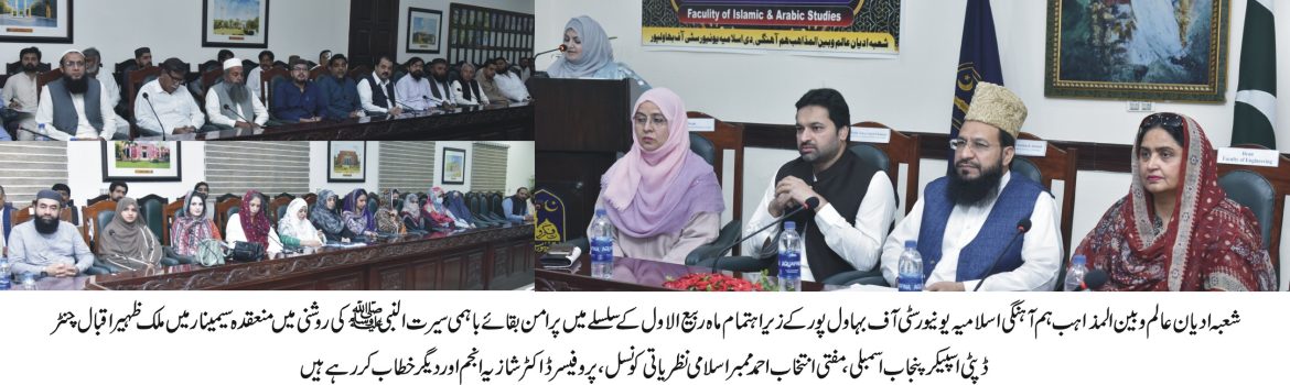 شعبہ ادیان عالم و بین المذاہب ہم آہنگی اسلامیہ یونیورسٹی آف بہاول پور کے زیر اہتمام ماہ ربیع الاول کے سلسلے میں پر امن بقائے باہمی سیر ت النبی ﷺ کی روشنی میں سیمینار کا انعقاد کیا گیا۔ تقریب کے مہمان خصوصی ملک ظہیر اقبال چنٹر ڈپٹی اسپیکر پنجاب اسمبلی اور مہمان اعزاز مفتی انتخاب احمد ممبر اسلامی نظریاتی کونسل تھے۔ اس موقع پر پروفیسر ڈاکٹر شازیہ انجم ڈین فیکلٹی آف کیمیکل اینڈ بائیو لوجیکل سائنسز، پروفیسر ڈاکٹر روبینہ بھٹی ڈین فیکلٹی آف سوشل سائنسز، پروفیسرڈاکٹر محمد امجد ڈین فیکلٹی آف انجینئرنگ اینڈ ٹیکنالوجی، پروفیسر ڈاکٹر جواد اقبال ڈین فیکلٹی آف مینجمنٹ سائنسز اینڈ کامرس،قاری عبدالستار، سینئر اساتذہ کرام، افسران اور طلبا وطالبات موجود تھے۔ملک ظہیر اقبال چنٹر ڈپٹی اسپیکر پنجاب اسمبلی نے سیرت النبیﷺ کے موضوع پر سیمینار کے انعقاد کو سراہا۔ انہوں نے کہا کہ آپ ﷺ کی زندگی ہمارے لیے راہ نجات ہے۔ ہم آپ ﷺ کی تعلیمات پر عمل کرتے ہوئے اپنی زندگی کو اسلام کے اصولوں کے مطابق گزار سکتے ہیں اور دین و دنیا سنوار سکتے ہیں۔ انہوں نے کہا کہ اسلامیہ یونیورسٹی بہاول پور عظیم آثاثہ ہے اور اساتذہ کرام قابل احترام ہیں۔ مفتی انتخاب احمد نے اپنے خطاب میں کہا کہ اللہ تعالیٰ نے حضرت محمد ﷺ کو تمام کائنات کے لیے رحمت بنا کر بھیجا ہے۔ آپ ﷺ کا اسوہ حسنہ تمام انسانوں کے لیے دنیا اور آخرت میں کامیابی کا ذریعہ ہے۔ ہم خوش قسمت لوگ ہیں کہ ہم آپﷺ کی امت سے ہیں۔ قرآن پاک میں ارشاد ہے کہ آپ ﷺ کو تمام کائنات کے لیے رحمت بنا کر بھیجا گیا ہے۔ زمانہ جہالت میں لوگ اپنی بیٹیوں کو زندہ دفن کر دیتے تھے اور لڑائی جھگڑئے بہت عام بات تھی لیکن آپﷺ کی آمد کے بعد ریاست میں تمام انسانوں کو حقوق دیئے گئے۔ اسلام ایک دوسرے کی مد د کرنے اور داد رسی کا حکم دیتا ہے۔ آپ ﷺ کی سیرت طیبہ ہمارے لیے کھلی کتاب ہے۔ ہمیں آپﷺ کی سیرت کا مطالعہ کرنا چاہیے۔ آج کی تقریب ہمارے لیے درس ہے کہ ہم ایک دوسرے کے ساتھ حسن سلوک کے ساتھ رہیں۔ بین المذاہب لوگوں کے ساتھ بھی اچھا سلوک کریں اور ان کے حقوق ادا کریں۔ تاریخ اسلام میں ہم دیکھتے ہیں کہ آپ ﷺ نے جو معاہدے کیے ان کو پورا کیا اور نہ صرف مسلمانوں کے ساتھ معاہدوں کی پاسداری کی بلکہ کافروں کے ساتھ بھی کیے ہوئے معاہدوں کو پورا کیا۔انہوں نے کہا کہ اسلامیہ یونیورسٹی بہاول پورکی بنیاد بھی اسلامی تعلیم کے ساتھ ساتھ دیگر مضامین کی تعلیم کے لیے رکھی گئی جو آج نہ صرف پاکستان بلکہ انٹرنیشنل لیول پر بھی اپنی پہچان بنا چکی ہے اور معاشرے میں اپنافعال کردار ادا کر رہی ہے۔ پروفیسر ڈاکٹر شازیہ انجم نے تمام مہمان شرکاء کا شکریہ ادا کیا۔ انہوں نے کہا کہ آج کی تقریب کا مقصد آپ ﷺ کی تعلیمات پر عمل کرتے ہوئیاسلام کو اپنی زندگیوں میں مکمل طور پر داخل کرنا ہیتاکہ ہم دنیا اور آخرت میں کامیاب ہو سکیں۔ آپ ﷺ کی زندگی تمام انسانوں کے لیے ایک نمونہ ہے جس کو اپناتے ہوئے ہم کامیاب ہو سکتے ہیں۔ آج ہمیں سیرت النبی ﷺ کی ان روشن مثالوں کو اپنی زندگیو ں میں شامل کرنے کی ضرورت ہے تاکہ ایک پرامن اور معتدل معاشرہ تشکیل دے سکیں۔ پرامن بقائے باہمی کی یہ تعلیمات صرف مسلمانوں کے لیے نہیں بلکہ پوری انسانیت کے لیے ہیں۔ ڈاکٹر سجیلہ کوثر چیئرپرسن شعبہ ادیان عالم و بین المذاہب ہم آہنگی نے خطبہ استقبالیہ پیش کیا اور تمام مہمانوں کی آمد پر شکریہ ادا کیا۔ انہوں نے سیمینار کے انعقاد اور سرپرستی پر وائس چانسلر پروفیسر ڈاکٹر نویدا ختر کا شکریہ ادا کیا۔