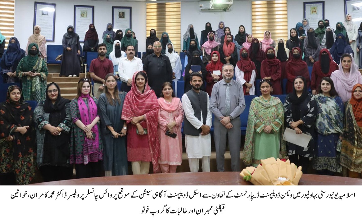 اسلامیہ یونیورسٹی بہاولپور میں ویمن ڈویلپمنٹ ڈیپارٹمنٹ کے تعاون سے گزشتہ دنوں حکومت پنجاب کے یوتھ ایمبیسیڈر اور یوتھ انٹرپرینیورئل پچ کمپیٹیشن اقدامات کے ذریعے سکل ڈویلپمنٹ کے بارے میں آگاہی سیشن کا انعقاد کیا گیا۔ پروفیسر ڈاکٹر محمد کامران وائس چانسلر نے اجلاس کی صدارت کی اور اپنے خطاب میں ویمن ڈویلپمنٹ ڈیپارٹمنٹ حکومت پنجاب کے اقدامات کو سراہا۔ انہوں نے ایک کامیاب آگاہی سیشن کے انعقاد پر پروفیسر ڈاکٹر روبینہ بھٹی ڈین فیکلٹی آف سوشل سائنسز کی چیئرپرسن فاطمہ جناح ویمن لیڈرشپ سنٹر اور ویمن ڈویلپمنٹ سنٹر و آئی یو بی سکول آف سٹیٹ سائنسز کی ڈائریکٹر ڈاکٹر سرفراز بتول کی کاوشوں کو بھی سراہا۔ سیشن کا مقصد خواتین فیکلٹی اور طالبات کو یوتھ ایمبیسیڈر پروگرام اور یوتھ انٹرپرینیورئل پچ کمپیٹیشن کے اقدامات کے ذریعے ہنر مندی کے فروغ کے بارے میں آگاہ کرنا تھا۔ اس تقریب میں مختلف فیکلٹیز سے طالبات کی بڑی تعداد اپنی سینئر خواتین اساتذہ اور خواتین انچارج سٹوڈنٹس افیئرز کے ساتھ موجود تھیں۔ پروفیسر ڈاکٹر نسرین اختر ڈین فیکلٹی آف آن لائن اینڈ ڈسٹنس ایجوکیشن پروفیسر ڈاکٹر اریبہ خان ڈائریکٹر فنانشل اسسٹنس پروفیسر ڈاکٹر ثمر فہد ڈاکٹر عالیہ نذیر ڈاکٹر عائشہ شوکت ڈاکٹر فرحین مکشوف ڈاکٹر نووین سہیل ڈاکٹر بشری ثمرین ڈاکٹر بشریٰ صادق ڈاکٹر شبانہ نذر ڈاکٹر مریم عباس سہروردی اور فاطمہ مظاہر موجود تھیں۔
