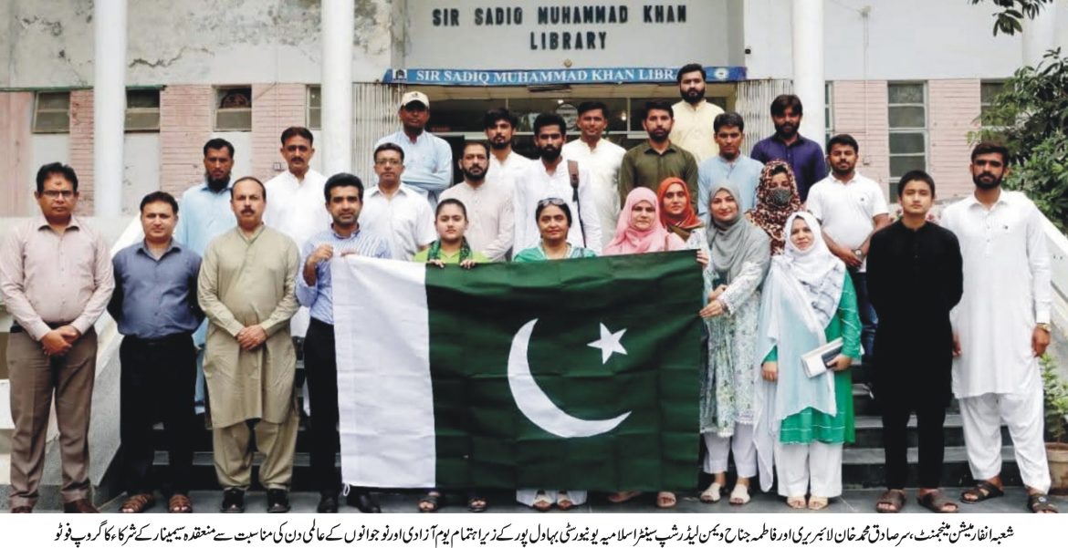 اسلامیہ یونیورسٹی بہاولپور کے شعبہ انفارمیشن مینجمنٹ، سر صادق محمد خان لائبریری اور فاطمہ جناح ویمن لیڈرشپ سنٹر نے مشترکہ طور پر پاکستان کے یوم آزادی اور نوجوانوں کے عالمی دن کے حوالے سے ایک سیمینار کا انعقاد کیا۔ یہ تقریب جناح کارنر، سر صادق محمد خان لائبریری میں ہوئی اور اس میں طلباء، فیکلٹی ممبران اور ملازمین نے شرکت کی۔ سیمینار میں نظامت کے فرائض نائلہ شمس الحق نے سرانجام دیئے، جنہوں نے شرکاء کو خوش آمدید کہا اور تقریب کی اہمیت پر روشنی ڈالی۔ تقریب کی مہمان خصوصی، ڈین فیکلٹی آف سوشل سائنسز پروفیسر روبینہ بھٹی نے نوجوانوں کے لیے قائداعظم کے پیغام کا اعادہ کرتے ہوئے متاثر کن خطاب کیا۔ انہوں نے اس بات پر زور دیا کہ نوجوانوں کو دیانتداری، محنت اور حب الوطنی کو برقرار رکھتے ہوئے ملک کے مستقبل کی ذمہ داری قبول کرنی چاہیے۔ انہوں نے قوم کی تعمیر میں نوجوانوں کے کردار اور پاکستان کے لیے قائداعظم کے وژن پر غور کرنے کی اہمیت پر زور دیا۔ پروفیسر سلمان بن نعیم نے بانی پاکستان قائد اعظم محمد علی جناح کے وضع کردہ اتحاد، ایمان اور نظم و ضبط کے لازوال اصولوں پر روشنی ڈالی۔ انہوں نے نوجوانوں پر زور دیا کہ وہ ان اقدار کو اپنا کر ملک کی ترقی میں بامعنی کردار ادا کریں۔ اس موقع پر عرفان حسین طاہر چیف لائبریرین، حافظ عامر رسول اسسٹنٹ پروفیسر شعبہ انفارمیشن مینجمنٹ، ڈاکٹر محمد یونس ایسوسی ایٹ پروفیسر شعبہ انفارمیشن مینجمنٹ، ڈاکٹر مریم عباس سہروردی ایسوسی ایٹ پروفیسر شعبہ معاشیات، ڈاکٹر ماہ بشریٰ اصغر ایسوسی ایٹ پروفیسر شعبہ انفارمیشن مینجمنٹ نے اپنے خیالات سے آگاہ کیا۔ پینل میں محمد سلیم ڈپٹی لائبریرین، علی ذوالقرنین ڈپٹی لائبریرین بھی شامل تھے جنہوں نے لائبریری سائنسز اور تعلیمی ترقی کے بارے میں اپنے نقطہ نظر کا اظہار کیا۔سیمینار نے کامیابی کے ساتھ حاضرین میں حب الوطنی اور حوصلہ افزائی کے جذبے کو فروغ دیا، جس سے ان میں پاکستان کی ترقی میں مثبت کردار ادا کرنے کے لیے نئے عزم کا اظہار ہوا۔