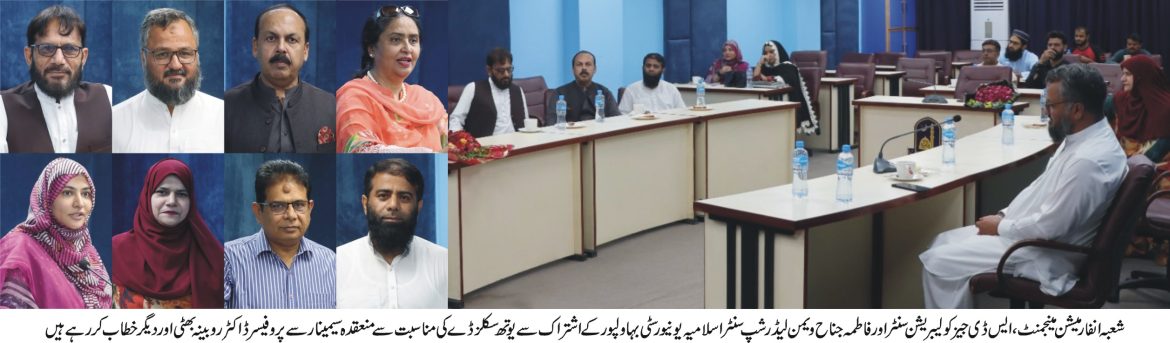 اسلامیہ یونیورسٹی بہاولپور کے شعبہ انفارمیشن مینجمنٹ نے ایس ڈی جیز کولیبریشن سنٹر اور فاطمہ جناح ویمن لیڈرشپ سنٹر کے اشتراک سے یوتھ سکلز ڈے کی مناسبت سے سیمینار کا انعقاد کیا۔