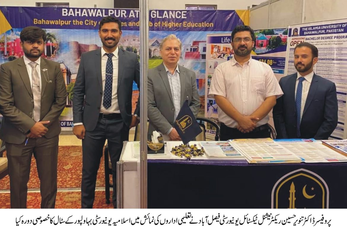 اسلامیہ یونیورسٹی بہاول پور ملک بھر سے طلباوطالبات کو اپنے ہاں داخلوں کے لیے خوش آمدید کہتی ہے۔ جامعہ کے اساتذہ اور طلبانے فیصل آباد میں منعقد ہونے والی ایجوکیشنل ایکسپو میں شرکت کی۔ اس موقع پر ڈاکٹر شہیرحسن رضوی لیکچرار شعبہ مینجمنٹ سائنسز نے کہا کہ سینٹرل پنجاب خصوصا فیصل آباد شہر اور گردونواح کے شہر اور قصبوں کے طلباوطالبات نے اسلامیہ یونیورسٹی بہاول پورمیں آئی ٹی، انجینئرنگ، فارمیسی، الائیڈ ہیلتھ سائنسز، نرسنگ، انٹرپرینیورشپ، مینجمنٹ اور کامرس اور ایم فل و پی ایچ ڈی کے پروگراموں میں دلچسپی کا اظہار کیا ہے۔ لیکچرار اسدالرحمن نے کہا کہ اسلامیہ یونیورسٹی بہاول پور اپنے خوبصورت کیمپسز، ہاسٹلز، ٹرانسپورٹ، سپورٹس اور میڈیکل کی سہولت کے باعث پنجاب بھر کے طلباوطالبات کے لیے خصوصی کشش رکھتی ہے۔ حالیہ داخلہ مہم میں پنجاب کے تمام علاقوں سے درخواستیں وصول ہو رہی ہیں۔ ریکٹر نیشنل ٹیکسٹائل یونیورسٹی فیصل آباد پروفیسر ڈاکٹر تنویر حسین نے اسلامیہ یونیورسٹی بہاول پور کے سٹال کا خصوصی دورہ کیا اور ایکسپو میں شرکت کو سراہا۔اس موقع پر اسٹاف ممبران سی سی آرز ریحان بشیر، حافظ محمد اسلم اور شعبہ انٹرنیشنل ریلیشنز کے طالب علم حمزا حفیظ بھی موجود تھے۔