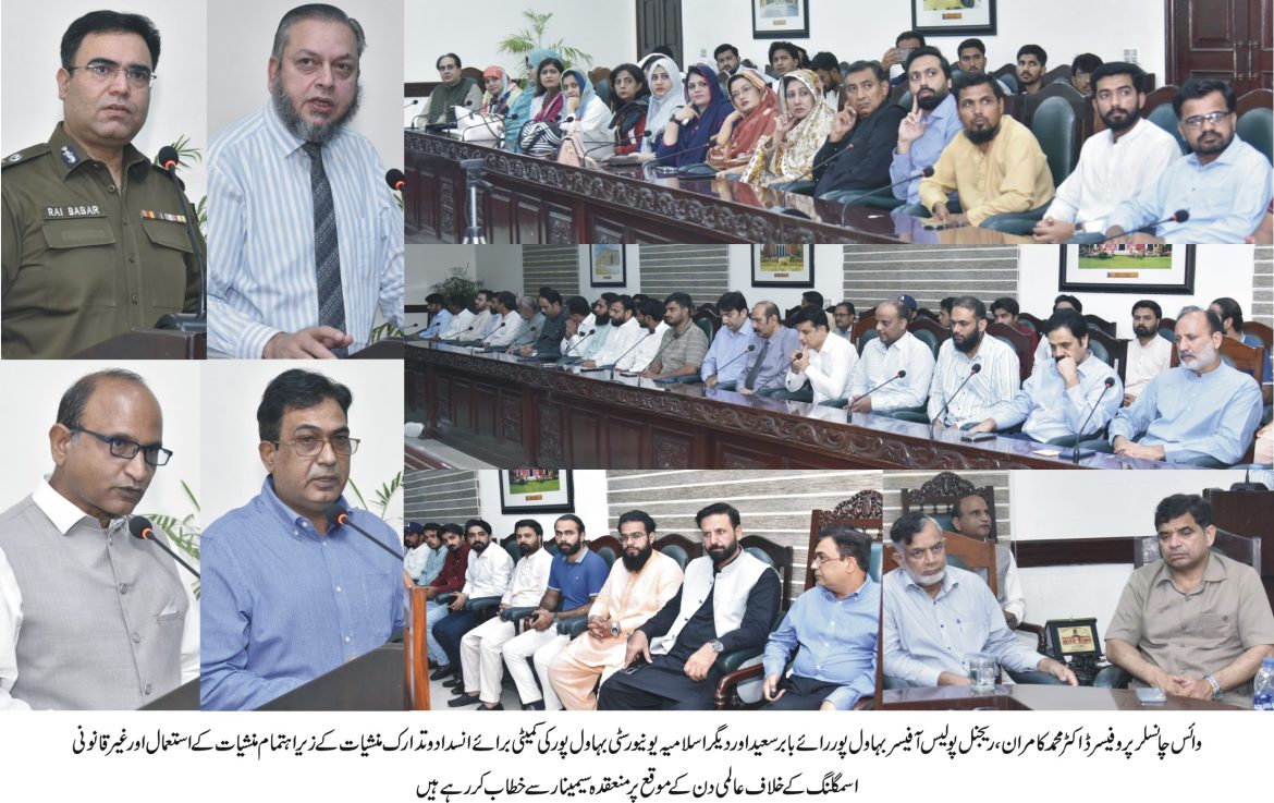 )اسلامیہ یونیورسٹی بہاول پور کی کمیٹی برائے انسداد و تدارک منشیات کے زیر اہتمام منشیات کے استعمال اور غیر قانونی اسمگلنگ کے خلاف عالمی دن کے موقع پر عباسیہ کیمپس میں خصوصی سیمینار منعقد ہوا۔ اس موقع پر ریجنل پولیس آفیسربہاول پور رائے بابر سعید مہمان خصوصی تھے اور صدارت وائس چانسلر پروفیسر ڈاکٹر محمد کامران نے کی۔ ریجنل پولیس آفیسر بہاول پور رائے بابر سعید نے کہا کہ منشیات ایک عالمی مسئلہ ہے۔ نوجوان نسل کو اس سے بچانا اور محفوظ رکھنا متعلقہ اداروں کے ساتھ ساتھ والدین اور معاشرے کی مشترکہ ذمہ داری ہے۔ اس سلسلے میں تعلیمی اداروں کا کردار بہت اہم ہے جو تسلسل سے منشیات کی روک تھام اور مضر اثرات سے بچاؤ کے لیے آگاہی پھیلاتے ہے۔ رائے بابر سعید نے کہا کہ نوجوانوں سے رابطہ بہت ضروری ہے۔ انہیں مثبت سرگرمیوں میں مصروف رکھ کر ان کے مسائل سے آگاہی حاصل کرکے اس مسئلے کے روک تھام میں خاصی مدد مل سکتی ہے۔ نوجوانوں کو فعال اور مثبت طرز زندگی کی جانب راغب کرنے کے لیے اداروں بمشول پولیس والدین اور تعلیمی اداروں کا باہمی ربط اور تعاون ضروری ہے۔ نوجوان نسل سے عدم رابطے کی خلیج کو پر کرنا ہوگا۔ اس طرح انسداد منشیات کے ادارے اس وقت کامیاب ہو سکتے ہیں جب وہ معاشرے میں اچھے تاثر کے حامل ہوں۔ انہوں نے اسلامیہ یونیورسٹی بہاول پور میں قائم کی گئی خصوصی کمیٹی کی جانب سے 2 ماہ کی آگاہی مہم کے انعقاد کو سراہتے ہوئے اسے جاری رکھنے اور پولیس اور دیگر اداروں کی سرگرمیوں سے مربوط کرنے پر ضرور دیا۔ انہوں نے کہا کہ جامعہ کے اساتذہ اور پولیس افسران پر مشتمل ایک خصوصی کمیٹی بھی تشکیل دی جائے جو اس سلسلے میں مشترکہ کوششیں کریں۔ وائس چانسلر پروفیسر ڈاکٹر محمد کامران نے تقریب میں خصوصی شرکت پر ریجنل پولیس آفیسر بہاول پور کا شکریہ ادا کیا اور کہا کہ یونیورسٹی سے تعاون کے جذبے کو سراہا۔ انہوں نے کہا کہ وہی ملک اور معاشرے کامیاب ہیں جہاں منشیات سے متعلق زیرو ٹالرینس ہے۔ ہمیں اپنے نوجوان نسل خصوصا طلباو طالبات کو منشیات کی لعنت سے دور رکھنے کے لیے مسلسل رابطے میں رکھنا ضروری ہے۔ فوکل پرسن پروفیسر ڈاکٹر فیاض الدین نے گزشتہ سال انسداد منشیات اور اس کے مضر اثرات سے متعلق آگاہی پھیلانے کے لیے تمام فییکلٹیز اور شعبہ جات میں سیمینار اور آگاہی مہم کی تفصیل پیش کی۔ انہوں نیکہا کہ یہ آگاہی مہم یونیورسٹی میڈیکل یونٹ، ہاسٹل انتظامیہ،شعبہ تعلقات عامہ، ٹرانسپورٹ اور دیگر اداروں کے تعاون سے منعقد ہوئی۔ اس موقع پر قائد اعظم میڈیکل کالج سے ایسو سی ایٹ پروفیسر ڈاکٹر سعید اختر چوہدری نے منشیات اوراس کے معاشرے پر اثرات سے متعلق خصوصی لیکچر دیا۔