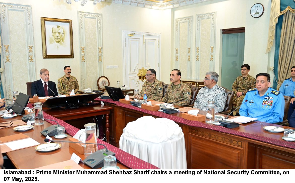 قومی سلامتی کمیٹی (این ایس سی) کا اجلاس اسلامی جمہوریہ پاکستان کے وزیرِ اعظم محمد شہباز شریف کی زیر صدارت منعقد ہوا۔ فورم نے بھارت کی جارحیت میں شہید ہونے والے بے گناہ شہریوں کے لیے فاتحہ خوانی کی، ان کے لواحقین سے دلی ہمدردی کا اظہار کیا اور زخمیوں کی جلد صحت یابی کی دعا کی۔ این ایس سی نے بھارت کی بلا اشتعال، بزدلانہ اور غیرقانونی جنگی کارروائی کے نتیجے میں پیدا ہونے والی سنگین صورتحال پر غور کیا۔