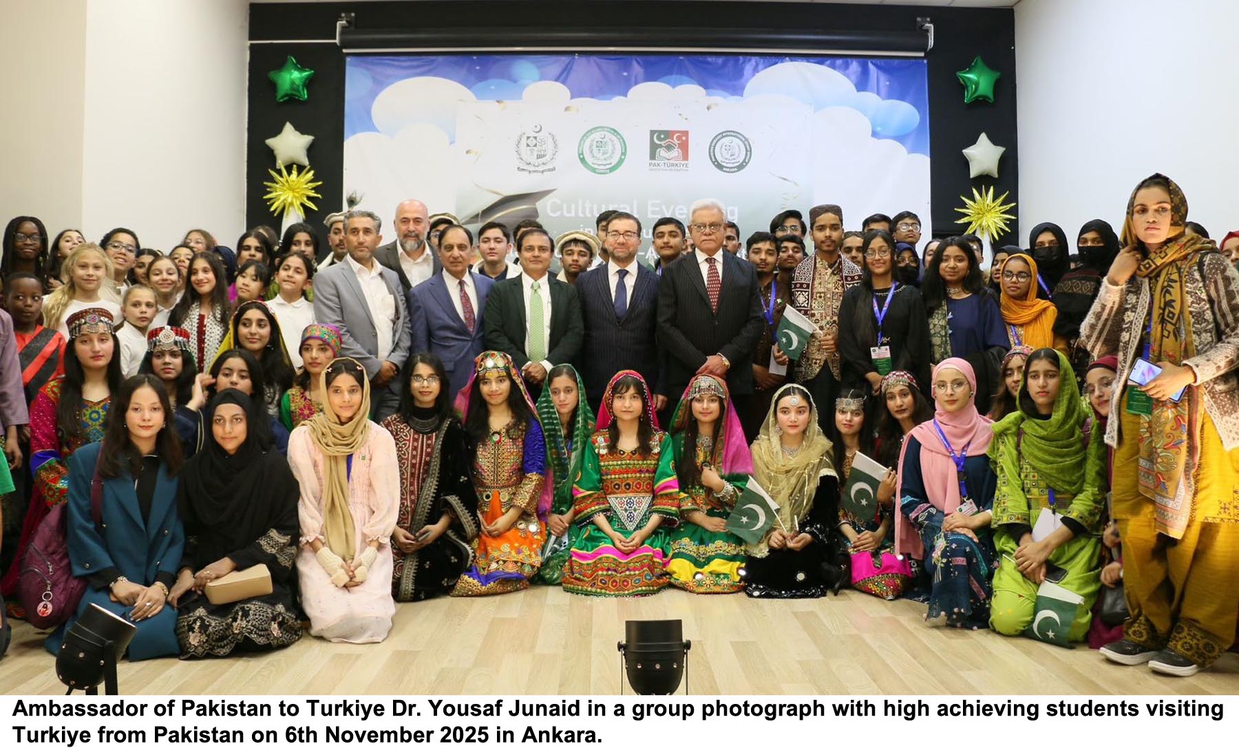 انقرہ: پاکستان کے سفارتخانے نے پاکستان ایمبیسی انٹرنیشنل اسٹڈی گروپ (PEISG) کے اشتراک سے ایک شاندار ثقافتی تقریب کا انعقاد کیا، جو ترکیہ کا دورہ کرنے والے اُن پاکستانی طلبہ کے اعزاز میں منعقد کی گئی جو وزیرِاعظم پاکستان جناب محمد شہباز شریف کی خصوصی تعلیمی و ثقافتی تبادلہ پروگرام کے تحت یہاں آئے ہیں۔ اس پروگرام کا مقصد تعلیمی لحاظ سے نمایاں کارکردگی دکھانے والے طلبہ کی حوصلہ افزائی اور پاکستان و ترکیہ کے درمیان تعلیمی و ثقافتی روابط کو فروغ دینا ہے۔تقریب میں پاکستان کے سفیر برائے ترکیہ ڈاکٹر یوسف جُنید، اوستِم ٹیکنیکل یونیورسٹی کے ریکٹر پروفیسر ڈاکٹر مرات علی یولک، پاکستان کی وزارتِ تعلیم کے سینئر جوائنٹ سیکریٹری جناب آفتاب رشید، ترکیہ کی وزارتِ قومی تعلیم کے سینئر حکام، اساتذہ اور معزز مہمانوں نے شرکت کی۔