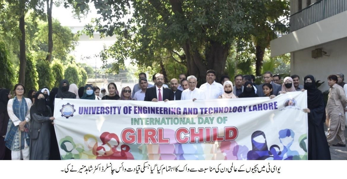 انٹرنیشنل ڈے آف گرل چائلڈ کی مناسبت سے یونیورسٹی آف انجینئرنگ اینڈ ٹیکنالوجی (یو ای ٹی) لاہور میں واک کا اہتمام کیا گیا، جس کی قیادت وائس چانسلر یو ای ٹی لاہور پروفیسر ڈاکٹر شاہد منیر (تمغہ امتیاز) نے کی۔ واک کا مقصد لڑکیوں کو بچپن سے لے کر 18 سال کی عمر تک درپیش چیلنجز کو اجاگر کرکے شرکاء میں شعور بیدار کرنا تھا۔