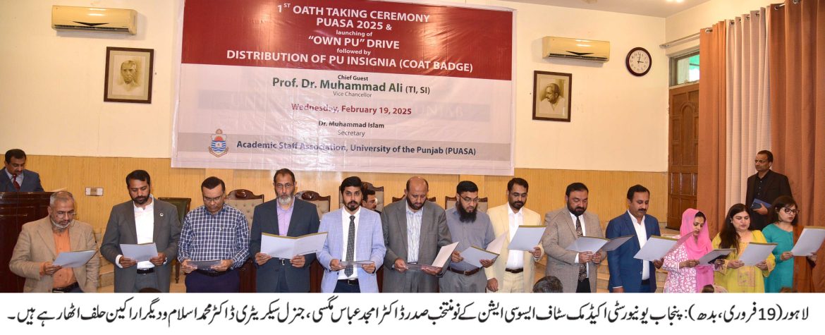 پنجاب یونیورسٹی اکیڈمک سٹاف ا یسو سی ایشن کے نومنتخب اراکین کی تقریب حلف برداری کا انعقاد الرازی ہال میں ہوا جس میں وائس چانسلر پروفیسر ڈاکٹر محمد علی، پرووائس چانسلر پروفیسر ڈاکٹر خالد محمود، ڈین فیکلٹی آف کامرس پروفیسر ڈاکٹر مبشر منور خان، آسا کے نو منتخب صدر ڈاکٹر امجد مگسی، سیکرٹری ڈاکٹرمحمد اسلام و دیگر عہدیداران سمیت اساتذہ نے بڑی تعداد میں شرکت کی۔ اس موقع پر اکیڈیمک سٹاف ایسوسی ایشن نے پنجاب یونیورسٹی کے مالی وسائل میں اضافے کے لئے ”پنجاب یونیورسٹی اپنائیے“مہم کا آغاز کر دیا۔پنجاب یونیورسٹی اپنے خطاب میں وائس چانسلر نے کہا کہ پنجاب یونیورسٹی کی بہتری کے لیے تبدیلیاں لا رہے ہیں۔ انہوں امید ظاہر کی کہ سب مل کر پنجاب یونیورسٹی کی ترقی میں کردار ادا کریں گے۔ انہوں نے کہا کہ التوا کا شکار سلیکشن بورڈ جلد کریں گے۔ انہو ں نے کہا کہ متعلقہ ڈینز کو 10 دن میں آسامیوں کی اہلیت کے کیسز بھیجنے کی ہدایات جاری کرچکے ہیں۔ انہوں نے کہا کہ یونیورسٹی میں ذیادہ سے ذیادہ سولر پینل لگائیں گے اورزرعی زمین کے بہتر استعمال کے لئے بھی ریفارمز لا رہے ہیں۔ انہو ں نے کہا کہ ہاسٹل اور ٹرانسپورٹ کا فنانشل ماڈل بہتر بنا نے کیلئے کوشاں ہیں۔ انہوں نے کہا کہ آسا کی’پنجاب یونیورسٹی اپنائیے‘مہم کو سراہتے ہیں۔ ڈاکٹر امجد عباس مگسی نے کہا کہ آسا اساتذہ کمیونٹی کی بھرپور نمائندگی کرے گی۔ انہوں نے کہا کہ پنجاب یونیورسٹی کو درپیش مالی چیلنجز کے سد باب اور تعلیمی مسائل کے حل کے لئے بھرپور تعاون کریں گے۔