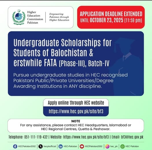 اسلام آباد (ایجوکیشن ڈیسک) ہائر ایجوکیشن کمیشن (HEC) نے بلوچستان اور سابق فاٹا کے طلبہ کے لیے انڈرگریجویٹ اسکالرشپ پروگرام (فیز III، بیچ IV) کی درخواست جمع کرانے کی آخری تاریخ میں توسیع 23 اکتوبر تک کر دی ہے۔یہ اسکالرشپ پروگرام ان علاقوں کے باصلاحیت مگر مالی طور پر پسماندہ طلبہ کو اعلیٰ تعلیم کے مواقع فراہم کرنے کے لیے شروع کیا گیا تھا۔ ایچ ای سی کے مطابق توسیع شدہ تاریخ کے بعد موصول ہونے والی درخواستیں قبول نہیں کی جائیں گی۔درخواست دہندگان کو ہدایت کی گئی ہے کہ وہ مقررہ نئی تاریخ کے اندر اندر اپنی آن لائن درخواستیں جمع کرائیں تاکہ وہ اس مالی معاونت کے پروگرام سے فائدہ اٹھا سکیں۔