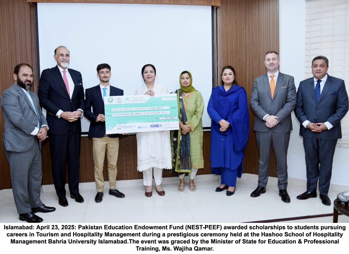 پاکستان ایجوکیشن انڈاؤمنٹ فنڈ (NEST-PEEF) نے سیاحت اور ہوٹلز مینجمنٹ کے شعبوں میں کیریئر بنانے والے طلبہ کو وظائف سے نوازا۔ یہ تقریب بحریہ یونیورسٹی اسلام آباد میں واقع ہاشو اسکول آف ہاسپیٹیلٹی مینجمنٹ میں منعقد ہوئی۔ اس پُروقار تقریب میں وزیرِ مملکت برائے تعلیم و پیشہ ورانہ تربیت محترمہ وجیہہ قمر، سی ای او PEEF، وزارتِ دفاع کی پارلیمانی سیکریٹری محترمہ زیب جعفر، ہاشو ہاسپیٹیلٹی اینڈ ایجوکیشن ڈویژن کے چیف آپریٹنگ آفیسر جناب حسیب اے. گردیزی، ہاشو گروپ کے سی ای او باسٹین بلانک، دیگر معزز حکام، نمایاں شخصیات، اور طلبہ نے شرکت کی۔یہ تقریب نجی و سرکاری شعبوں کے درمیان تعاون کی ایک علامت تھی جس کا مقصد پاکستان میں تعلیم کے فروغ، روزگار کے مواقع پیدا کرنے، اور سیاحت و ہاسپیٹیلٹی انڈسٹری میں معاشی ترقی کو فروغ دینا تھا۔