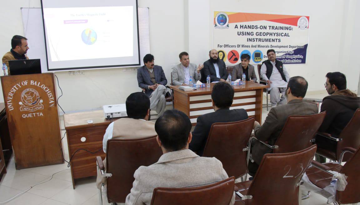 جامعہ بلوچستان کے شعبہ جیوفزکس میں مائنز اینڈ منرلز ڈپارٹمنٹ کے افسران کے لیے جیوفزیکل آلات کے عملی استعمال سے متعلق ایک ہفتہ تربیتی ورکشاپ کا باقاعدہ آغاز ہو گیا۔