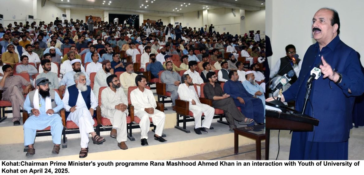 رانا مشہود احمد خان، چیئرمین وزیراعظم یوتھ پروگرام، نے کوہاٹ یونیورسٹی آف سائنس اینڈ ٹیکنالوجی میں منعقدہ مشاورتی اجلاس سے خطاب کیا۔ یہ اجلاس قومی نوعمر اور نوجوانوں کی پالیسی کے تحت منعقد کیا گیا تھا۔ اس موقع پر خیبر پختونخوا کے لیے وزیراعظم کے یوتھ کوآرڈینیٹر بابر سلیم بھی ان کے ہمراہ تھے۔ اجلاس میں یونیورسٹی کے طلباء، دینی مدارس کے طلباء، ترقیاتی شعبے کے نمائندگان اور یونیورسٹی کے اساتذہ نے شرکت کی۔