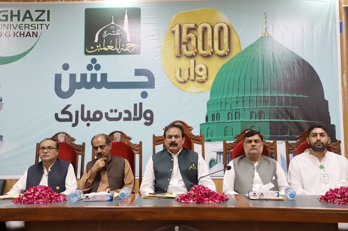 غازی یونیورسٹی ڈیرہ غازی خان میں وائس چانسلر پروفیسر ڈاکٹر اشفاق احمد کی زیر صدارت اور نظامت امور طلباء و شعبہ اسلامیات کے زیرِ اہتمام “جشن ولادت باسعادت مبارک” کے حوالے سے ایک پروقار محفلِ میلاد النبی ﷺ کا انعقاد کیا گیا۔ جس میں یونیورسٹی کے اساتذہ اور نمائندہ طلباء و طالبات شریک ہوئَے، اس موقع پر پروفیسر ڈاکٹر محمد کامران، پروفیسر ڈاکٹر ارشد منیر ، پروفیسر ڈاکٹر سعد اللہ لغاری، ڈاکٹر محمد آصف، ڈاکٹر ارم عزیز، ڈاکٹر راشدہ قاضی، ڈاکٹر محمد ابراہیم، ڈاکٹر محمد سہیل اختر سکھانی، ڈاکٹر وسیم عباس، ڈاکٹر ضیاء اللہ ضیاء، ڈاکٹر سلمان حیدر، ڈاکٹر ریحانہ بی بی، ڈاکٹر محمد علی تارڑ، اورڈاکٹر عمران لودھی و دیگر موجود تھے، نظامت کے فرائض شعبہ اسلامیات سے ڈاکٹر اشفاق احمد نے ادا کیئے، یہ بابرکت محفل نہ صرف طلبہ و طالبات کے لیے ایمان افروز ثابت ہوئی بلکہ اس نے سب شرکاء کو سیرتِ رسول ﷺ کے عملی تقاضوں کی طرف متوجہ کیا۔ تقریب کا باقاعدہ آغاز تلاوتِ کلامِ پاک سے ہوا، جس کی سعادت محمد اسید نے حاصل کی۔ قرآنِ حکیم کی روح پرور تلاوت نے محفل میں ایک خاص نورانیت اور سکون پیدا کیا۔ اس کے بعد ہاجرہ بی بی نے آقائے دو جہاں ﷺ کی بارگاہ میں عقیدت کے پھول نچھاور کرتے ہوئے نعتیہ کلام پیش کیا۔ اس کے بعد عشرہ رحمت للعالمین میں سابقہ مقابلہ جات میں جن بچوں نے پہلی پوزیشن حاصل کی تھی، ان بچوں نے اس پروگرام میں دوبارہ اپنی کارکردگی پیش کی، عزیر خالد نے اپنی روح پرور آواز میں اذان پیش کی۔حسنین ریاض نے ہدیہ نعت رسول مقبول ﷺ پیش کیا۔ حافظ حمزہ ابراہیم نے موئثر انداز میں انگریزی زبان میں سیرت النبی ﷺ بیان کی۔ مہمان سپیکر مولانا فہد عزیز نے اپنی تقریر میں کہا کہ حضور اکرم ﷺ کی سیرت انسانیت کے لیے کامل نمونہ ہے۔ آپ ﷺ نے امن، محبت اور اخوت کا درس دیا۔ آپ ﷺ کی زندگی عدل و انصاف اور رحم دلی سے بھرپور تھی۔ یتیموں، مسکینوں اور ضرورت مندوں کے لیے آپ ﷺ کی شفقت بے مثال تھی۔ دنیا و آخرت کی کامیابی کا راز آپ ﷺ کی سیرت سے ملتا ہے اور اس پر عمل پیرا ہو کر ہی کامیابی ممکن ہے۔
