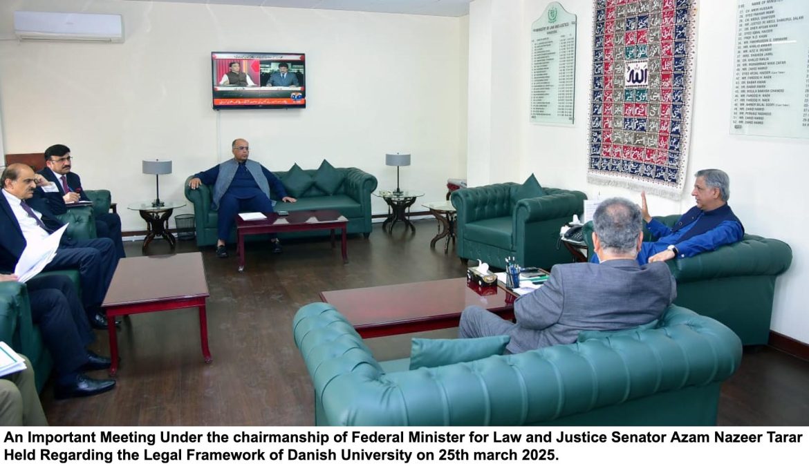 وزیر اعظم میاں شہباز شریف کی ہدایات پر، آج ایک اہم اجلاس وفاقی وزیر قانون اعظم نذیر تارڑ کی زیر صدارت منعقد ہوا، جس میں دانش یونیورسٹی کے قانونی ڈھانچے پر تبادلہ خیال کیا گیا۔ اجلاس میں ہائر ایجوکیشن کمیشن (ایچ ای سی) کے چیئرمین اور دیگر سینئر حکام نے شرکت کی۔اجلاس کے دوران، وزیر قانون نے اس بات پر زور دیا کہ دانش یونیورسٹی ایک خودمختار ادارہ ہوگی، جو حکومتی مداخلت سے آزاد ہو کر کام کرے گی۔ انہوں نے کہا کہ یونیورسٹی کا قانونی ڈھانچہ جدید خطوط پر استوار کیا جائے گا تاکہ اسے دنیا کی بہترین یونیورسٹیوں کے معیار سے ہم آہنگ کیا جا سکے۔