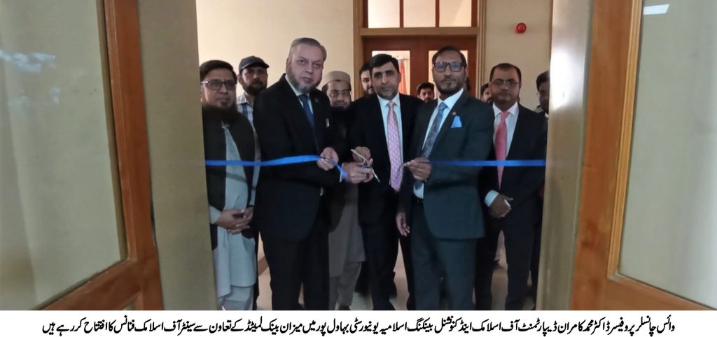 پروفیسرڈاکٹر محمد کامران وائس چانسلر نے ڈیپارٹمنٹ آف اسلامک اینڈ کنونشنل بینکنگ انسٹی ٹیوٹ آف بزنس مینجمنٹ اینڈ ایڈمنسٹریٹو سائنسز اسلامیہ یونیورسٹی بہاولپور اور میزان بینک لمیٹڈ کے تعاون سے قائم کیے گئے سنٹر آف اسلامک فنانس کا افتتاح کیا۔ ڈین فیکلٹی آف مینجمنٹ سائنسز اینڈ کامرس اور انسٹی ٹیوٹ آف بزنس مینجمنٹ اینڈ ایڈمنسٹریٹو سائنسز کے ڈائریکٹر پروفیسر ڈاکٹر جواد اقبال  سنٹر آف اسلامک فنانس کے بانی اور سرپرست ہیں ۔ اس سنٹر کا قیام اسلامیہ یونیورسٹی آف بہاولپور کے عالمی روابط اور مقامی ضروریات کے مطابق اسلامی مالیات کی ترقی کے عزم کی نشاندہی کرتا ہے۔  یہ اسلامی مالیاتی شعبوں میں تعلیم، تحقیق اور صنعت کی شمولیت کے لیے ایک مرکز کے طور پر کام کرے گا۔ اس موقع پر اسلامیہ یونیورسٹی بہاولپور اور میزان بینک لمیٹڈ کے درمیان مفاہمت کی یادداشت پر بھی دستخط ہوئے۔  میزان بینک کے شریعہ بورڈ کے ممبر مفتی زبیر احمد شامل نے بینکنگ کے طریقوں کو شرعی اصولوں کے ساتھ ہم آہنگ کرنے کی اہمیت پر زور دیا۔میزان بینک کے دیگر افسران میں عابد حسین ملک ڈسٹری بیوشن ہیڈ اعجاز ندیم ریجنل جنرل منیجر بہاولپور ابرار حسین ایریا منیجر بہاولپور نوید الحسن ریجنل آپریشنز منیجر مفتی محمد شعیب شریعہ سکالرشامل تھے۔ اسٹیٹ بینک آف پاکستان کے نمائندوں راس مسعود سینئر ڈپٹی چیف منیجر نعمان علی اسسٹنٹ چیف منیجراور فخر فراز اسسٹنٹ ڈائریکٹر بھی شریک ہوئے۔  انچارج ڈیپارٹمنٹ آف اسلامک اینڈ کنونشنل بینکنگ اور سنٹر آف اسلامک فنانس کے فوکل پرسن ڈاکٹر اویس شفیق نے پائیدار اقتصادی ترقی کے حصول میں اسلامی فنانس کے اسٹریٹجک کردار پر زور دیا۔ انہوں نے کہا کہ سنٹر آف اسلامک فنانس نہ صرف علمی اور پیشہ ورانہ تربیت فراہم کرے گا بلکہ فن ٹیک اختراعات، گرین فنانس اور بینکنگ کے طریقوں کے لیے راستے بھی بنائے گا۔اس موقع پر پروفیسر ڈاکٹر اریبہ خان ڈائریکٹر فنانشل اسسٹنس پروفیسر ڈاکٹر عبدالماجد مکی چیئرمین شعبہ کامرس ڈاکٹر حسن مجتبیٰ نواز سلیم سربراہ شعبہ فنانس ڈاکٹر جاوید اقبال چیئرمین شعبہ مینجمنٹ اینڈ ہیومن ریسورس مینجمنٹ ڈاکٹرمحمد ناظم شعبہ سپلائی چین مینجمنٹ ڈاکٹر عمر فاروق لیکچرر اور ریسرچ کوآرڈینیٹر شعبہ اسلامک اینڈ کنونشنل بینکنگ ڈاکٹر محمد نعیم شاہد سینئر فیکلٹی چولستان یونیورسٹی آف ویٹرنری اینڈ اینیمل سائنسز بہاولپور بھی موجود تھے۔