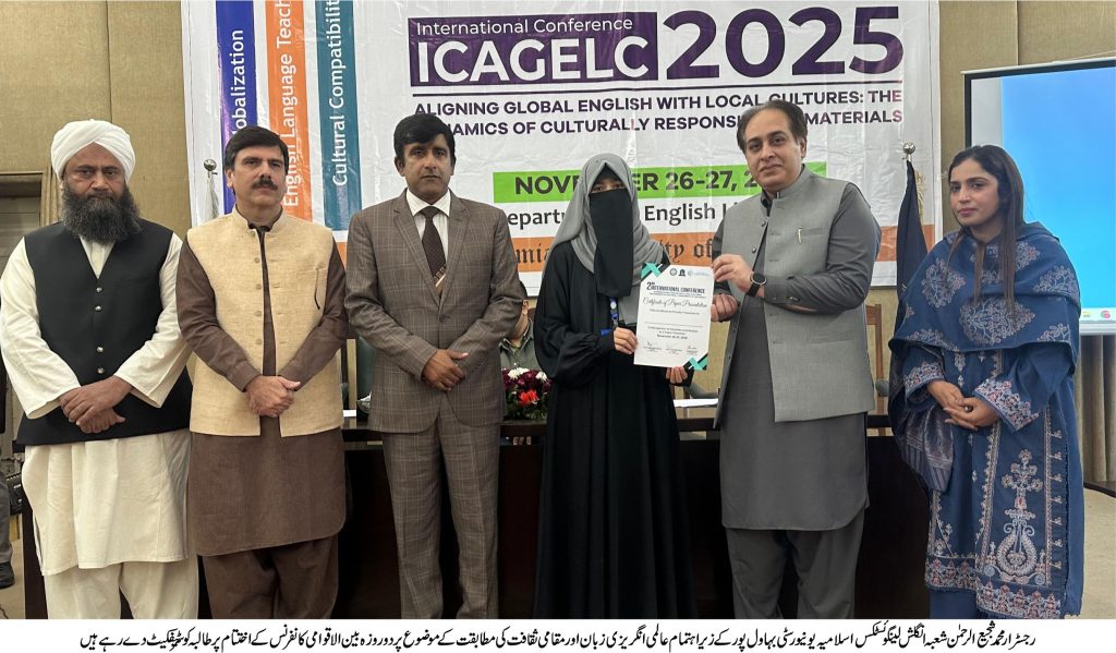 شعبہ انگلش لینگوئسٹکس اسلامیہ یونیورسٹی بہاول پور کے زیر اہتمام عالمی انگریزی زبان اور مقامی ثقافت کی مطابقت کے موضوع پر دو روزہ بین الاقوامی کانفرنس اختتام پذیر ہو گئی۔ دوروزہ کانفرنس میں ترکیہ ،عمان اور پاکستانی جامعات سے مندوبین شریک ہوئے۔اختتامی سیشن میں رجسٹرار محمد شجیع الرحمن، ریزیڈنٹ آڈیٹرشہزاد اختر مہمانان اعزاز تھے۔ چیئرمین شعبہ ڈاکٹر ریاض حسین نے کہا ہے کہ دو روزہ بین الاقوامی کانفرنس میں 28 مقالہ جات پیش کیے گئے۔ انگریزی زبان کے طلباو طالبات کو لسانیات کی مختلف جہتوں ، ثقافتی ہم آہنگی ، لسانیات کی عالمی اور مقامی مطابقت جاننے اور موازنہ کرنے کا موقع ملا۔انہوں نے کانفرنس کے انعقاد میں تعاون اور سرپرستی پر وائس چانسلر پروفیسر ڈاکٹر محمد کامران اور ڈین فیکلٹی آف آرٹس اینڈ لینگویجز پروفیسر ڈاکٹر سید عامر سہیل کا شکریہ ادا کیا۔ اس موقع پرچیئرمین شعبہ سوشل ورک پروفیسر ڈاکٹر محمد آصف نوید رانجھا، ایڈیشنل رجسٹرار عارف رموز اور طلباو طالبات نے شرکت کی۔