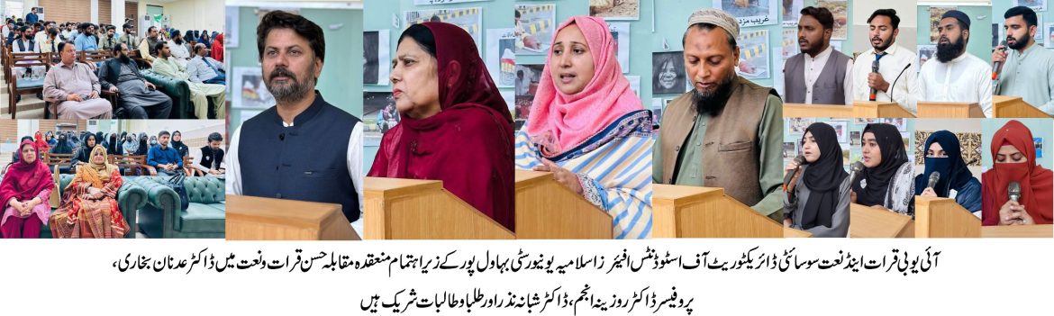 بسلسلہ صد سالہ تقریبات اسلامیہ یونیورسٹی بہاولپور آئی یو بی قرأت اینڈ نعت سوسائٹی ڈائریکٹوریٹ اسٹوڈنٹس افیئرز اسلامیہ یونیورسٹی بہاول پور کے زیر اہتمام پرائم منسٹر یوتھ ڈویلپمنٹ سنٹر بغداد الجدید کیمپس میں مقابلہ حسن قرأت و حسن نعت رسول مقبول ﷺکا انعقاد کیا گیا۔ ڈاکٹر عدنان بخاری ایڈیشنل ڈائریکٹر اسٹوڈنٹس افیئرز اور منصفین پروفیسر ڈاکٹر روزینہ انجم سابقہ چیئرپرسن شعبہ فارسی، ڈاکٹر آصف ندیم ایڈوائزر پرفارمنگ آرٹ سوسائٹی، ڈاکٹر سجیلہ کوثرچیئرپرسن ڈیپارٹمنٹ آف ورلڈ ریلیجن اینڈ انٹرفیتھ ہارمنی، ڈاکٹر حافظ محمد صدیق، ڈاکٹر محمد شاکرحسین ڈیپارٹمنٹ اسلامک سٹڈیز، ڈاکٹر حافظ ذیشان احمد عارفین اور ڈاکٹر حافظ ذیشان راشد ڈیپارٹمنٹ الیکٹریکل انجینئرنگ نے سرانجام دیئے۔ ڈاکٹر شبانہ نذر ایڈوائزر آئی یو بی قرأت ونعت سوسائٹی نے خصوصی شرکت پر اساتذہ کرام کا شکریہ ادا کیا اور طلباء وطالبات کی پرجوش شرکت کو سراہا۔