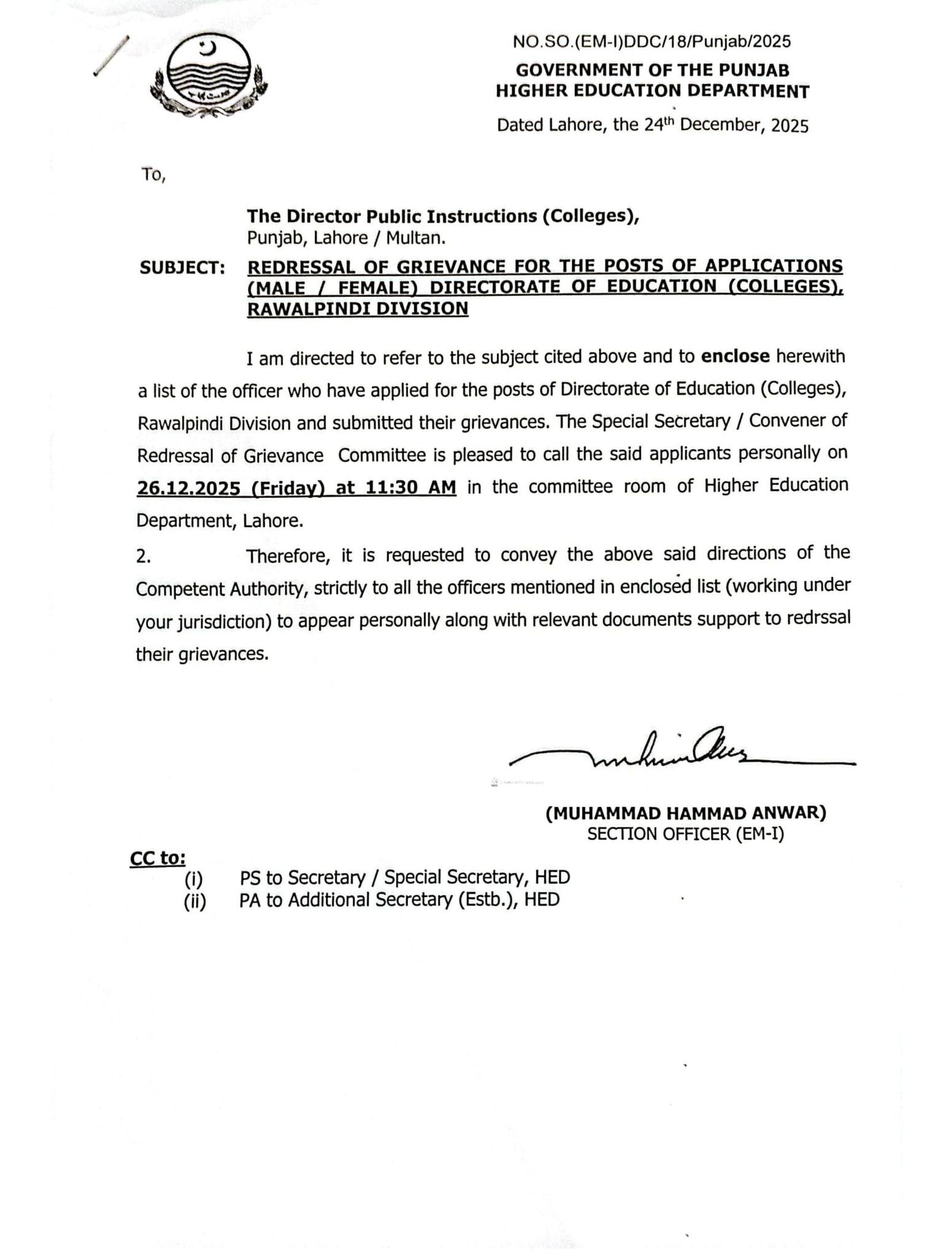محکمہ ہائر ایجوکیشن پنجاب نے ڈائریکٹر آف ایجوکیشن (کالجز)، راولپنڈی ڈویژن کے عہدے کے لیے درخواست گزار امیدواروں کی شکایات کے ازالے (Grievance Redressal) کی سماعت کا شیڈول جاری کر دیا ہے۔محکمہ کی جانب سے جاری اعلامیے کے مطابق شکایات کی سماعت جمعہ، 26 دسمبر 2025 کو صبح 11:30 بجے منعقد ہوگی۔ سماعت کا مقام کمیٹی روم، محکمہ ہائر ایجوکیشن، لاہور مقرر کیا گیا ہے۔