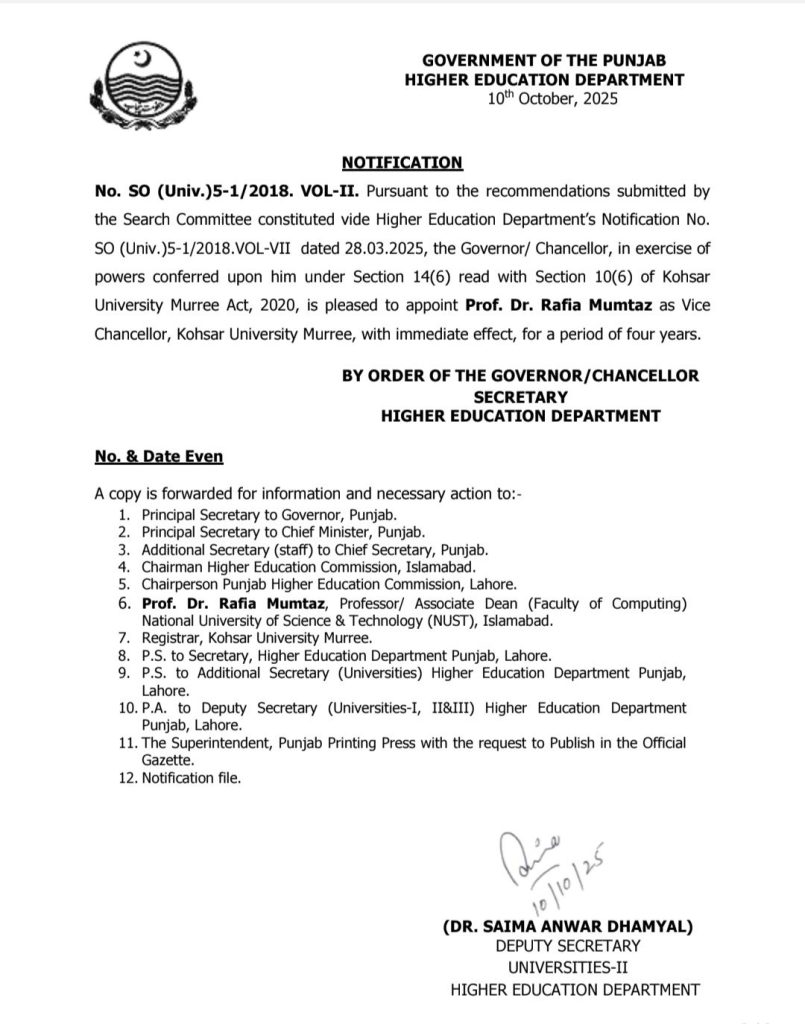مری: کوہسار یونیورسٹی مری کی نئی وائس چانسلر کے طور پر پروفیسر ڈاکٹر رافیہ ممتاز نے اپنی ذمہ داریاں سنبھال لی ہیں۔ وہ آئندہ چار سال کے لیے اس عہدے پر خدمات انجام دیں گی۔اس موقع پر ایک پُرتپاک تقریبِ استقبالیہ منعقد کی گئی، جس میں پرو وائس چانسلر پروفیسر ڈاکٹر محمد سلطان، رجسٹرار محترمہ نسیم اختر، اور فیکلٹی ممبران نے ڈاکٹر رافیہ ممتاز کو خوش آمدید کہا اور نیک تمناؤں کا اظہار کیا۔ڈاکٹر رافیہ ممتاز نے اس موقع پر کہا کہ وہ کوہسار یونیورسٹی میں اکیڈمک ایکسیلنس، تحقیق کے فروغ اور طلبہ مرکوز ترقی کے لیے پرعزم ہیں۔ انہوں نے اس عزم کا اظہار کیا کہ جدیدیت، شمولیت، اور مضبوط قیادت کے ذریعے کوہسار یونیورسٹی کو نئی بلندیوں تک پہنچایا جائے گا۔یونیورسٹی کے اساتذہ، طلبہ، اور عملے نے ان کی تقرری کو خوش آئند قرار دیتے ہوئے امید ظاہر کی کہ ان کی قیادت میں کوہسار یونیورسٹی ترقی اور کامیابی کے ایک نئے دور میں داخل ہوگی۔