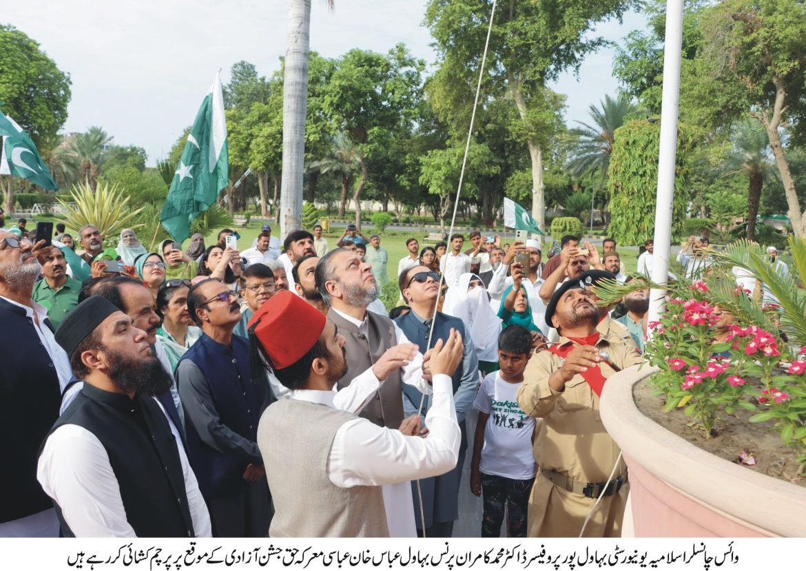 معرکہ حق جشن آزادی اور اسلامیہ یونیورسٹی بہاول پور کی صد سالہ تقریبات کے سلسلے میں پرچم کشائی کی پروقار تقریب عباسیہ کیمپس میں منعقد ہوئی۔ وائس چانسلر اسلامیہ یونیورسٹی بہاول پور پروفیسر ڈاکٹر محمد کامران اور پرنس بہاول عباس خان عباسی نے پرچم کشائی کی۔ اس موقع پریونیورسٹی سیکورٹی کے دستے نے قومی پرچم کو سلامی پیش کی۔ تقریب سے خطاب کرتے ہوئے وائس چانسلرپروفیسر ڈاکٹر محمد کامران نے کہا کہ 14 اگست ہمارے قومی وجود کا سنگ میل ہے۔ پاکستان علامہ اقبال کی بصیرت اور قائد اعظم کی قیادت کا شاہکار ہے۔ وائس چانسلر نے محسن پاکستان و بانی جامعہ اسلامیہ بہاول پور نواب سر صادق محمد خان عباسی پنجم کی قیام پاکستان اور استحکام پاکستان کے لیے خدمات کو خراج تحسین پیش کیا۔ انہوں نے کہا کہ حالیہ دنوں میں دشمن نے ہماری سرحدوں پر جارحیت کی تو ہماری افواج نے نہ صرف جغرافیائی بلکہ نظریاتی سرحدوں کی حفاظت کا بہترین ثبوت دیا۔ قائد اعظم نے فرمایا تھا کہ دنیا کی کوئی طاقت پاکستان کو ختم نہیں کر سکتی ۔ یہ ملک ہمیشہ قائم رہنے کے لیے بنا ہے۔ نواب بہاول عباس خان عباسی نے اپنے خطاب میں کہا کہ نواب سرصادق محمد خان عباسی پنجم نے تحریک پاکستان میں بڑھ چڑھ کر حصہ لیا اور قیام پاکستان کے لیے بہاول پور کی خدمات بے مثال ہیں۔ بہاول پور پہلی ریاست تھی جو پاکستان میں شامل ہوئی۔ ریاست بہاول پور نے نوزائیدہ مملکت پاکستان کو بھرپور مالی امداد کے ساتھ ساتھ انتظامی طور پر بھی مدد کی۔ انہوں نے اسلامیہ یونیورسٹی بہاول پور کی سو سالہ تقریبات پر وائس چانسلر ، اساتذہ اور طلباو طالبات کو مبارکباد دی۔ نواب بہاول عباس خان عباسی نے کہا کہ اسلامیہ یونیورسٹی بہاول پور میں وائس چانسلر کی زیر قیادت تدریس وتحقیق کو جدید خطوط پر استوار کرنے خصوصا آرٹیفیشل انٹیلیجنس کو تمام علوم سے منسلک کرنے کا اقدام بہت خوش آئند ہے۔ اس موقع پر صادق پبلک سکول بہاول پور کے استاد نعمان فاروقی نے ریاست بہاول پور کے تعلیمی ، سماجی اور معاشی اقدامات اور نواب سر صادق محمد خان عباسی پنجم کی خدمات پر تفصیلی روشنی ڈالی۔ وائس چانسلر پروفیسر ڈاکٹر محمد کامران نے نواب بہاول پور عباس خان عباسی کو یادگاری شیلڈ پیش کی۔ اس موقع پر جشن آزادی کے سلسلے میں شعبہ اسٹیٹ کیئر کی جانب سے وائس چانسلر اور نواب بہاول عباس خان عباسی نے طلباء وطالبات میں شجر کاری مہم کے پودے تقسیم کیے۔ وائس چانسلر اور پرنس بہاول عباس خان عباسی نے حبیب بنک لمیٹڈ کی جانب سے اسلامیہ یونیورسٹی بہاول پور میں شجرکاری مہم کا آغاز کیا۔ وائس چانسلر نے سیلانی ویلفیئر آرگنائزیشن کی جانب سے یونیورسٹی ملازمین کے لیے دئیے گئے تحائف بھی تقسیم کیے۔