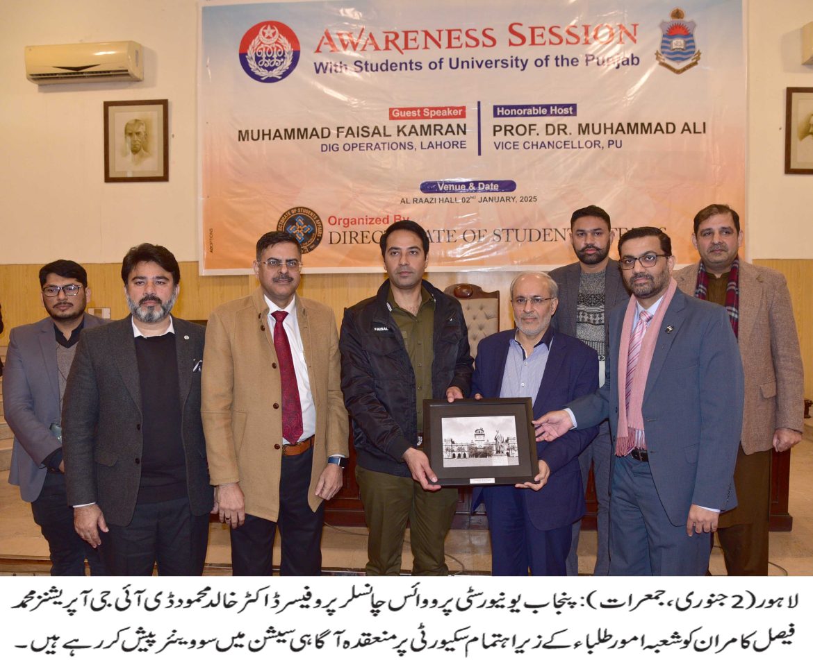 ڈی آئی جی آپریشنزمحمد فیصل کامران نے کہا ہے کہ ملک میں امن کے قیام اورانتہا پسندی کے خاتمے کے لئے سب کومثبت کردار ادا کرنا ہونا ہوگا۔وہ پنجاب یونیورسٹی شعبہ امور طلباء کے زیر اہتمام سکیورٹی پرمنعقدہ آگاہی تقریب سے الرازی ہال میں خطاب کررہے تھے۔ اس موقع پر پنجاب یونیورسٹی کے پرووائس چانسلر پروفیسر ڈاکٹر خالد محمود،ڈی جی پنجاب یونیورسٹی ڈاکٹر ریحان صادق شیخ، ڈائر یکٹر شعبہ امور طلباء ڈاکٹر شاہزیب خان، چیئرمین ہال کونسل ڈاکٹر محبوب حسین، فیکلٹی ممبران،پولیس افسران اور طلباؤ طالبات نے بڑی تعداد میں شرکت کی۔ اپنے خطاب میں ڈی آئی جی آپریشنزمحمد فیصل کامران نے کہا کہ آگاہی مہم کامقصد عوام اور پولیس کے درمیان رشتے کو مضبوط بنانا ہے۔ انہوں نے کہا کہ نوجوان طلباء پاکستان کا سرمایہ ہے جن کی درست رہنمائی ملک کو آگے لے جا سکتی ہے۔ انہوں نے کہا کہ پنجاب پولیس کے افسران کی طرف سے کھلی کچہریاں لگائی جا تی ہیں جس میں سائل دوپہر 12بجے تا2بجے تک اپنے مسائل کے تدارک کے لئے آ سکتے ہیں۔انہوں نے کہا کہ کسی بھی دوسرے ملک چلے جائیں توکوئی قانون شکنی کی جرات نہیں کرتاجبکہ پاکستان میں قانون ہونے کے باجود لوگ اس پر عمل نہیں کرتے۔انہوں نے کہا کہ پتنگ اڑانا غیر قانونی ہے مگر لوگ پرواہ نہیں کرتے۔انہوں نے کہا کہ ٹریفک قوانین کی پاسداری ضروری ہے لیکن اس پر بھی عمل نہیں ہوتا اورحادثات کی شرح میں اضافہ ہوتا ہے۔ انہوں نے کہا کہ ہمیں ایسا معاشرہ تشکیل دینا ہے کہ ہماری بچیاں سڑکوں پر خود کو محفوظ تصورکر سکیں۔ انہوں نے کہا کہ آگاہی پروگرام کے انعقادپر پنجاب یونیورسٹی انتظامیہ کے شکر گزار ہیں۔پرووائس چانسلر پروفیسر ڈاکٹر خالد محمود نے کہا کہ اداروں اور عوام کے درمیان اعتماد کو فروغ دینے کے لئے ایسی تقاریب خوش آئند ہیں۔ انہوں نے کہا کہ پاکستان میں قوانین موجود ہیں لیکن مسئلہ عمل درآمد کا ہے۔ انہوں نے کہا کہ پنجاب یونیورسٹی ملک میں امن و سلامتی کے لئے ہمیشہ اداروں کے ساتھ ہے۔ ڈاکٹر شاہزیب خان نے کہا کہ پنجاب یونیورسٹی کاشعبہ امور طلباء اپنے نوجوان طلباء کی رہنمائی کے لئے متحرک کردار ادا کرتا رہے گا۔ انہوں نے کہا کہ پنجاب یونیورسٹی سے فارغ التحصیل طلباء پاکستان سمیت دنیا بھر میں اپنی صلاحیتوں کا لوہا منوا رہے ہیں۔