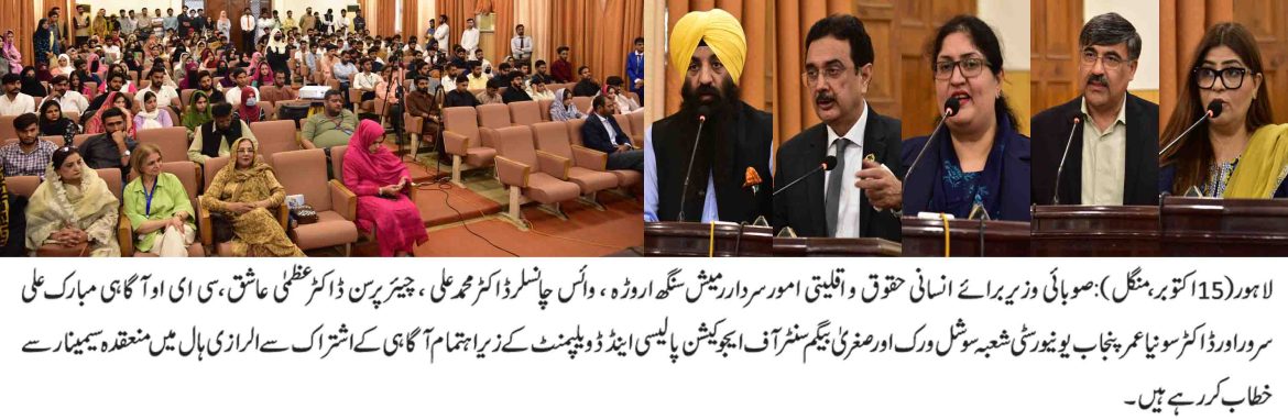 :صوبائی وزیربرائے انسانی حقوق اور اقلیتی امور سرداررمیش سنگھ اروڑہ نے کہا ہے کہ ماحولیاتی تحفظ کو یقینی بنانے اور موسمیاتی تبدیلیوں سے نمٹنے کے لیے میڈیااورریاستی اداروں کو مل کر کام کرنا ہوگا۔ وہ پنجاب یونیورسٹی شعبہ سوشل ورک اور صغریٰ بیگم سنٹر آف ایجوکیشن پالیسی اینڈ ڈویلپمنٹ کے زیر اہتمام آگاہی کے اشتراک سے ’پائیدار سماجی طرز عمل: موسمیاتی تبدیلی کا مقابلہ کرنا‘ پرالرازی ہال میں منعقدہ سیمینار سے خطاب کررہے تھے۔ اس موقع پر،وائس چانسلر پنجاب یونیورسٹی پروفیسر ڈاکٹر محمد علی،ڈین فیکلٹی آف بیہوریل اینڈ سوشل سائنسز ڈاکٹر ارم خالد، چیئرپرسن شعبہ سوشل ورک پروفیسر ڈاکٹر عظمیٰ عاشق، چیف ایگزیکٹیو آفیسر آگاہی مبارک علی سرور،ڈبلیو ڈبلیو ایف سے مس فاطمہ، ڈاکٹر سونیا عمر، معروف کالم نگار سلمان عابد،فیکلٹی ممبران اور طلباؤطالبات نے بڑی تعداد میں شرکت کی۔اپنے خطاب میں صوبائی وزیر سردار رمیش سنگھ اروڑہ نے بہترین موضوع پر منعقدہ تقریب پر منتظمین کی کاوشوں کو سراہا۔ انہوں نے موسمیاتی تبدیلی کے حوالے سے حکومتی اقدامات پر وشنی ڈالی۔ وائس چانسلر ڈاکٹر محمد علی نے کہا ہے کہ پاکستان میں خوراک کی کمی نہیں لیکن متوازن خوراک کی ترسیل اور ہر شخص تک اس کی دستیابی کودیکھنا ضروری ہے۔انہوں نے کہا کہ پاکستان میں 40 فیصد پھل ضائع ہو جاتا ہے اورہم پینے والا پانی بھی بے تحاشہ ضائع کر رہے ہیں۔انہوں نے کہا کہ ڈرپ اریگیشن کی بجائے فلڈ اریگیشن کا طریقہ زراعت کے لئے مناسب نہیں۔ انہوں نے کہا کہ دودھ کی پیداوار میں پاکستان پانچواں بڑا ملک ہے، تاہم ہمیں خالص دودھ تک میسر نہیں۔ انہوں نے کہا کہ پوری دنیا کو ماحولیاتی تبدیلیوں کاسامنا ہے۔ انہوں نے کہا کہ ہمیں آئندہ نسلوں کو اپنے سے بہتر ماحول فراہم کرنا ہوگا۔ انہوں نے کہا کہ صفائی ہمارے مذہب کا حصہ ہے۔ ڈاکٹر عظمیٰ عاشق نے بتایا کہ کس طرح سوشل ورک کے طلباء مختلف اداروں میں اپنی تقرریوں کے ذریعے ماحول دوست پالیسیوں کی ترقی میں فعال کردار ادا کر رہے ہیں۔ انہوں نے مثبت سماجی تبدیلی لانے کے لیے شعبہ اور دیگر وزارتوں کے درمیان تعاون بڑھانے پر زور دیا۔سی ای او آگاہی مبارک علی سرور نے پائیدار طریقوں کو فروغ دینے میں اپنی تنظیم کی نمایاں کوششوں پر روشنی ڈالتے ہوئے کہا کہ صحت مند ماحول کو فروغ دینے اور موسمیاتی تبدیلی کے اثرات کو کم کرنے کیلئے اپنا کردار ادا کرتے رہیں گے۔ڈاکٹر سونیا عمر نے تمام اسٹیک ہولڈرز کا شکریہ اداکیااور معاشرے میں دیرپا مثبت تبدیلی پیدا کرنے کے لیے اکیڈیمیا اور ترقیاتی شعبے کے درمیان مشترکہ کوششوں کی اہمیت پر زور دیا۔