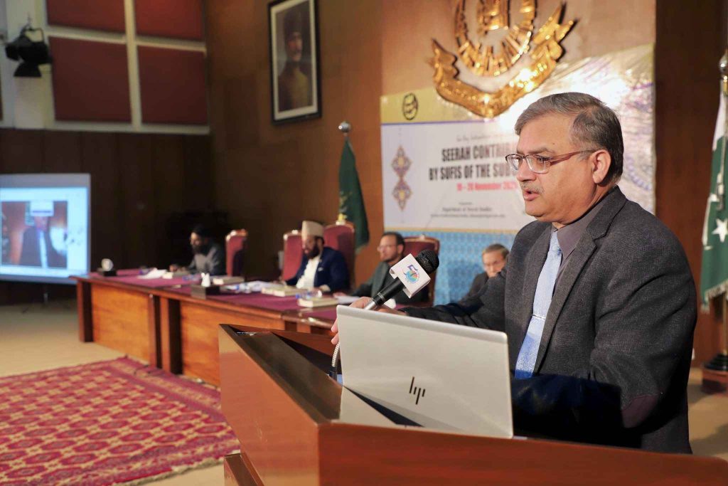 برصغیر کے صوفیاء نے اسی سیرت کو کتابوں سے نہیں، اپنے عمل سے زندہ کیا۔ وائس چانسلر کا کہنا تھا کہ برابری، رحم دلی، سادگی، نفس کی اصلاح اور اقتدار سے دوری برصغیر پاک و ہند کے صوفیاء کی عملی تعلیمات تھیں۔ڈاکٹر ناصر محمود نے مزید کہا کہ صوفیاء نے ذاتِ رسول ﷺ سے عشق کو زندگی کے ہر پہلو میں ایسا سمویا کہ معاشرہ اُن کے کردار سے سیکھتا رہا، ہماری آج کی گفتگو بھی اسی ورثے کو سمجھنے اور اپنی زندگیوں کو بہتر بنانے کا ذریعہ بنے گی۔