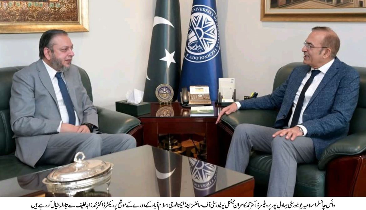 وائس چانسلر اسلامیہ یونیورسٹی بہاولپور پروفیسر ڈاکٹر محمد کامران نے نیشنل یونیورسٹی آف سائنسز اینڈ ٹیکنالوجی اسلام آباد کے دورہ کے دوران ریکٹر ڈاکٹر محمد زاہد لطیف سے ملاقات کی۔ دونوں تعلیمی رہنماؤں نے تعلیمی قیادت، یونیورسٹی گورننس اور پاکستان میں اعلیٰ تعلیم کے ابھرتے ہوئے منظر نامے پر گہری بات چیت کی۔ ملاقات کے دوران تعلیمی معیار کو مضبوط بنانے، تحقیقی عمدگی کو فروغ دینے، علم کی بنیاد پر بڑھانے اور بامعنی تعلیمی مکالمے کے لیے مشترکہ عزم کا اظہار کیا گیا۔ ریکٹر نے وائس چانسلر کو اپنی حال ہی میں جاری کردہ کتاب، پاکستان کی تلاش برائے امن و افغانستان، اسٹیٹ کرافٹ، پالیسی اور حکمت عملی کی ایک کاپی بھی پیش کی۔