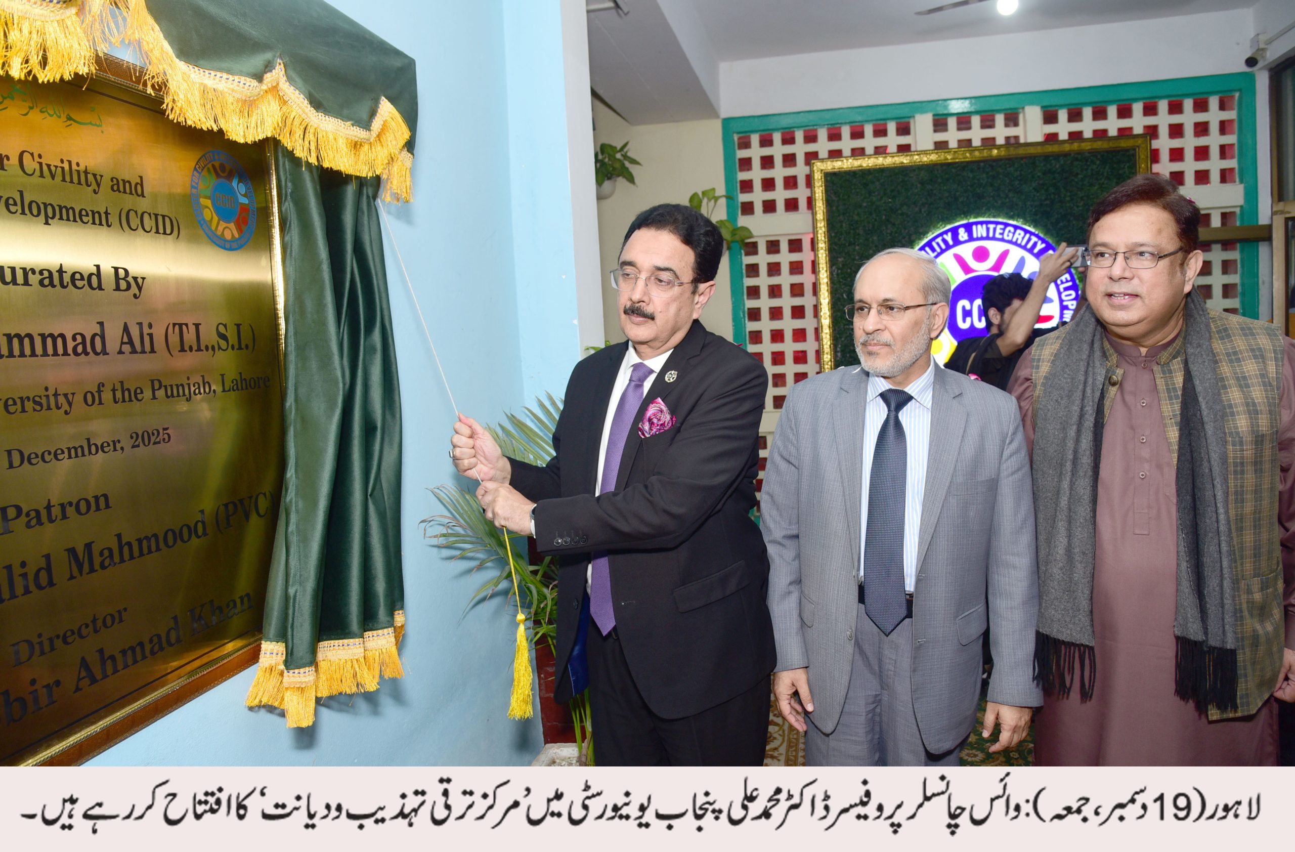 وائس چانسلر پروفیسر ڈاکٹر محمد علی نے پنجاب یونیورسٹی میں ’مرکز ترقی تہذیب ودیانت‘کا افتتاح کردیا۔اس سلسلے میں خصوصی تقریب کاانعقاد کیا گیا جس میں مرکزکے پیٹرن اور پرو وائس چانسلرپروفیسرڈاکٹرخالد محمود، بریگیڈیئر اسجد بلوچ، کرنل ریحان خان،ڈائریکٹر، مرکزِ ترقیِ تہذیب و دیانت ڈاکٹر شبیر احمداور طلباؤطالبات نے شرکت کی۔ اپنے خطاب میں پروفیسر ڈاکٹر محمد علی نے کہا کہ معاشرتی اصلاح اور قومی ترقی میں جامعات کا کرداراہم ہے۔ انہوں نے کہا کہ قومی و صوبائی اداروں کے اشتراک سے جامعات معاشرے میں رواداری، برداشت اور صبر و تحمل کے فروغ میں مؤثر کردار ادا کر سکتی ہیں۔انہوں نے ملکی سلامتی اور استحکام کے لیے عسکری اداروں اور اعلیٰ قیادت کی خدمات کو خراجِ تحسین پیش کیا۔پروفیسر ڈاکٹر خالد محمودنے کہا کہ جامعات صرف درس و تدریس کے مراکز نہیں ہیں بلکہ مختلف سماجی، علاقائی اور لسانی پس منظر رکھنے والے افراد کے مابین ہم آہنگی اور باہمی احترام کو فروغ دینے کے مراکز بھی ہیں۔ انہوں نے کہا کہ اختلافِ رائے کا احترام ایک مہذب معاشرے کی بنیاد ہے۔بریگیڈیئر اسجد بلوچ نے قومی اداروں اور جامعات کے مابین تعاون اور اشتراکِ عمل کی ضرورت پر زور دیا۔ انہوں نے کہا کہ ملکی سلامتی اور تحفظ کے لیے قومی و صوبائی اداروں اور تعلیمی اداروں کے درمیان قریبی روابط ناگزیر ہیں۔ انہوں نے کہا کہ نوجوان نسل قوم کا سرمایہ اور مستقبل ہے جبکہ اساتذہ قوم کی فکری و اخلاقی تعمیر میں ہراول دستے کا کردار ادا کرتے ہیں۔ڈاکٹر شبیر احمد خان نے مہمانوں کا خیر مقدم کرتے ہوئے مرکز کے قیام کے اغراض و مقاصدپر روشنی ڈالی۔ انہوں نے کہا کہ درس و تدریس کے ساتھ نوجوان نسل کے کردار کو مضبوط بنانا وقت کی اہم ضرورت ہے۔\