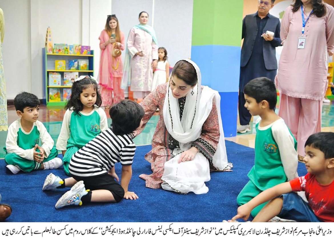 وزیر اعلیٰ پنجاب مریم نواز شریف نے پاکستان کے پہلے سٹیٹ آف آرٹ ”نواز شریف سینٹر آف ایکسی لینس فار ارلی چائلڈ ہوڈ ایجوکیشن“ میں انرولمنٹ مہم کا باقاعدہ آغاز کر دیا۔ سینٹر میں تمام نجی اداروں سے بہترین انتظامات، کلرفل کلاس روم، شاندار ماحول اور جدید طریقہ تعلیم متعارف کرایا گیا ہے۔ وزیر اعلیٰ مریم نواز شریف نے پری سکول بیل بجا کر سینٹر ایکسی لینس فار”ارلی چائلڈ ہوڈ ایجوکیشن“کا باقاعدہ آغاز کیا۔ انرولمنٹ مہم میں صوبائی وزیر تعلیم رانا سکندر حیات کا کمسن بیٹا محمد یوسف سینٹرفار ارلی چائلڈ ہوڈ ایجوکیشن میں سب سے پہلے داخلہ لینے والوں میں شامل ہیں۔ وزیر تعلیم رانا سکندر حیات اپنے بچے کو سرکاری سکول میں داخل کرانے والے پہلے صوبائی وزیر بن گئے۔ وزیراعلیٰ مریم نوازشریف نے نوازشریف سینٹر آف ایکسی لینس فار ارلی چائلڈ ہوڈ ایجوکیشن کی آفیشل یونیفارم کی رونمائی بھی کی۔ وزیر اعلیٰ مریم نواز شریف نے نواز شریف سینٹر آف ایکسی لینس فار ارلی چائلڈ ہوڈ ایجوکیشن کا دورہ کیا اور کمسن بچوں اور ان کے والدین سے بات چیت کی۔ والدین نے ارلی چائلڈ ہوڈ ایجوکیشن سینٹر بنانے پر وزیراعلیٰ مریم نواز شریف کو سراہا اور کہا کہ ارلی چائلڈ ہوڈ ایجوکیشن سینٹر جیسا ادارہ پاکستان میں نہیں، جہاں چھوٹے بچوں کو فری تعلیم ملے۔وزیر اعلیٰ مریم نواز شریف نے والدین اور بچوں کے ساتھ بیٹھ کر تصاویر بنوائی۔وزیر اعلیٰ مریم نواز شریف نے ہر کلاس روم اور آرٹ اینڈ ڈرائینگ روم کا معائنہ کیا۔ وزیر اعلیٰ مریم نواز شریف نے جم اور سوئمنگ پول کا بھی جائزہ لیا اور جم اور سوئمنگ پول کے ٹرینرز کو بچوں کی سیفٹی یقینی بنانے کی ہدایت کی۔ وزیر اعلیٰ مریم نواز شریف نے ہر کلاس روم میں جاکر بچوں کو تحائف پیش کیے۔ ننھی بچی نے وزیر اعلیٰ مریم نواز شریف سے دو گفٹ لیے اور کہا کہ ”ایک میرے لیے اور ایک میرے بھائی کے لئے؟“۔وزیر اعلیٰ مریم نواز شریف نے بچوں کے ساتھ ملکر ٹریفک سگنل سائن کا سانگ بھی گایا اور کلاس روم میں جاکر بچوں کے ساتھ قالین پر بیٹھ گئیں۔ وزیر اعلیٰ مریم نواز شریف نے کمسن بچے سے اظہار شفقت کرتے ہوئے کہا کہ ”کتنے کیوٹ لگ رہے ہیں“۔وزیر اعلیٰ مریم نواز شریف نے بچوں سے ان کے نام اور عمر بھی دریافت کی۔ننھے مصطفی نے وزیر اعلیٰ مریم نواز شریف سے گپ شپ کرتے ہوئے پوچھا کہ ”کھانے میں کیا پسند ہے؟“ ننھے نے کہا”سالن اور دہی“۔وزیر اعلیٰ مریم نواز شریف نے ننھے بچے سے مکالمہ کیا کہ ”عینک سر پر کیوں پہنی ہے،آنکھوں پر لگائیں“۔ننھے بچے نے اپنا نام لکھ کر دکھایا تو وزیراعلیٰ مریم نوازشریف نے اسے شاباش دی اور پیار کیا۔ آپ وہی ہیں جن کی بڑی بڑی تصویر یں لگی ہیں،ننھی طالبہ نے وزیراعلیٰ مریم نوازشریف کو پہچان کر مسرت کا اظہار کیا۔ وزیر اعلیٰ مریم نواز شریف نے بچوں کے لئے واش روم کا جائزہ لیا، صفائی برقرار رکھنے کا حکم دیا۔