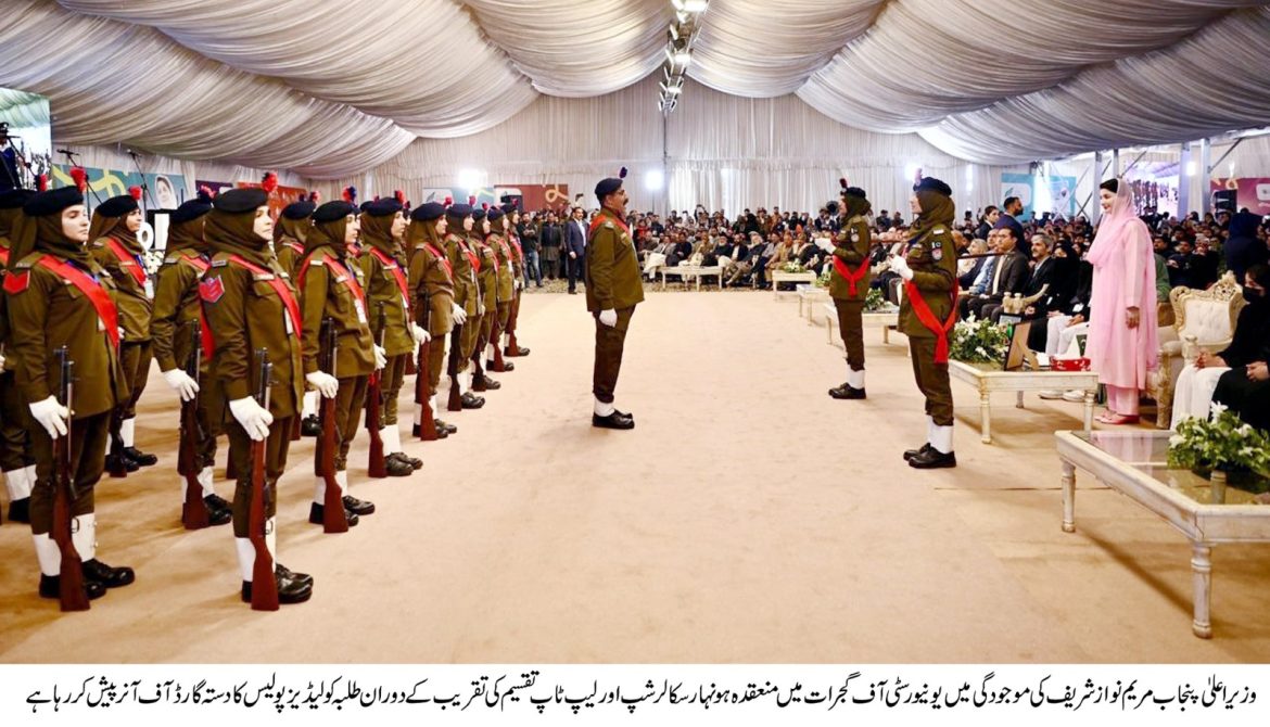 ‘ہر خواب ہے ممکن”۔یونیورسٹی آف گجرات کی طالبہ نے سی ایم کو منظوم خراج تحسین پیش کیا۔”سی ایم تے بوہتا احسان کر چھڈیا،پریشان لوکاں نوں حیران کر چھڈیا”۔”اینیاں کرائیاں صفایاں پنجاب وچ، پنڈاں نوں ملتان تے لاہور کر چھڈیا۔” وزیراعلی مریم نواز شریف کی یونیورسٹی آف گجرات آمد پر طلبہ نے پرتپاک استقبال کیا۔وزیراعلی مریم نواز شریف نے تقریب میں وزراء اور ارکان اسمبلی سے نشستوں پر جا کر سلام کیا۔وزیراعلی مریم نواز شریف طا لبات کے درمیان بیٹھ گئیں اور طلبہ کی درخواست پر سٹیج پر جاکران کے ساتھ قومی ترانہ پڑھا۔وزیراعلی مریم نواز شریف نے طلبہ کے ساتھ” اے راہ حق کے شہیدو ”” سوہنی دھرتی ”ملی نغمہ گایا اور پاکستان زندہ باد کا نعرہ لگایا۔ یونیورسٹی آف گجرات کی طالبہ نے وزیر اعلیٰ مریم نواز شریف سے پر جوش معانقہ کیا۔ طلبہ نے پر اثر ملی نغمہ پیش کیا۔طلبہ کے اعزاز میں لیڈیز پولیس کے چاق وچوبند دستے نے سلامی پیش کی۔ پولیس بینڈ نے مدھر سر بکھیرے۔ تقریب میں ”جرنی آف لیپ ٹاپ ” پر ڈاکومینٹری پیش کی گئی۔وزیراعلی مریم نواز شریف نے لیپ ٹاپ اور ہونہار سکالرشپ کے چیک تقسیم کیے