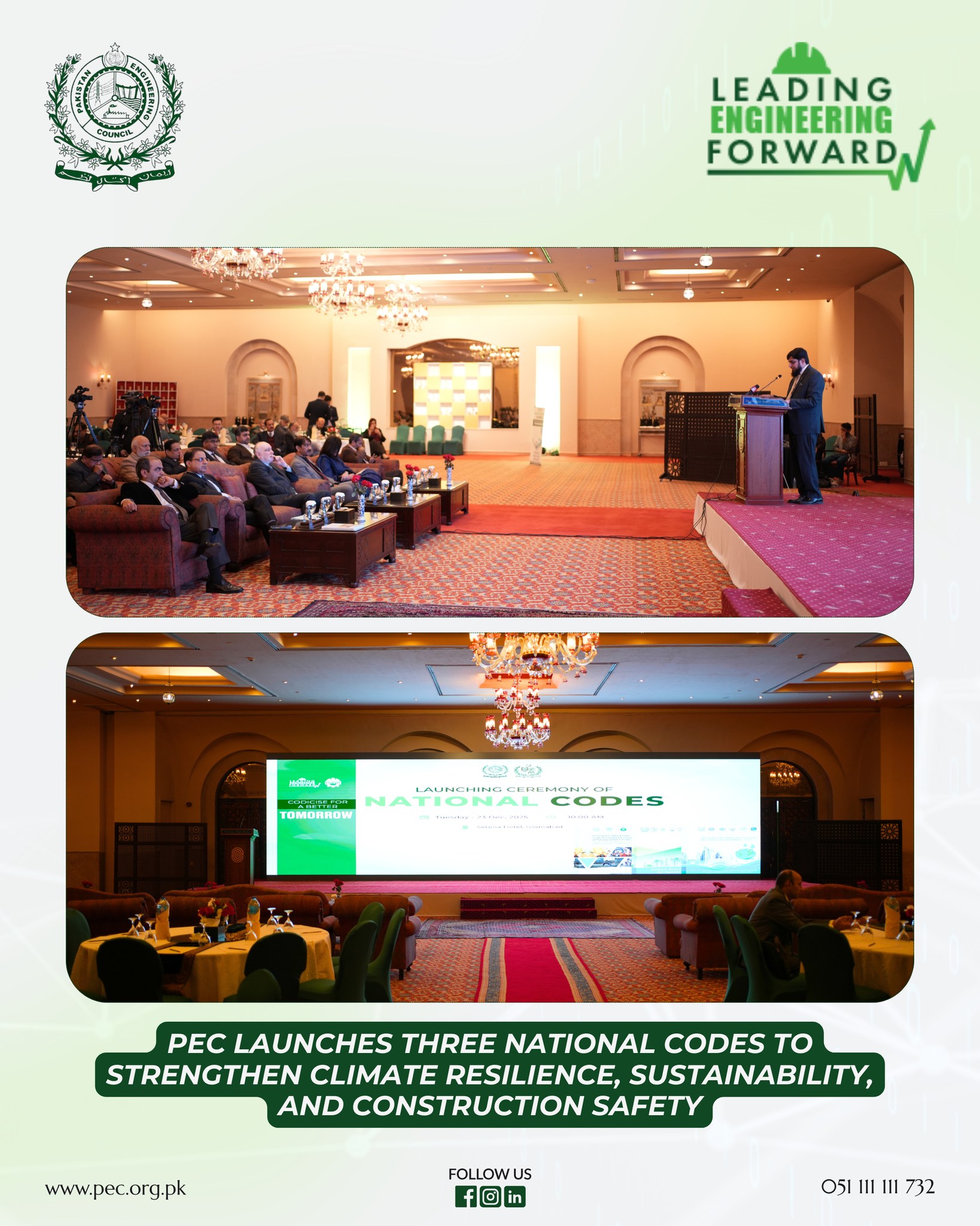 پاکستان انجینئرنگ کونسل (پی ای سی) نے ملک کے تعمیراتی اور انجینئرنگ شعبے کو عالمی معیار کے مطابق بنانے کے لئے تین اہم قومی کوڈز باضابطہ طور پر متعارف کرا دیئے ہیں، ان کوڈز میں گرین بلڈنگ کوڈ آف پاکستان، رین واٹر ہارویسٹنگ کوڈ اور تعمیراتی شعبے کے لئے پیشہ وارانہ حفاظت و صحت کا کوڈ شامل ہے، ان کوڈز کا مقصد ماحولیاتی تحفظ، پانی کے بہتر استعمال اور تعمیراتی مزدوروں کی حفاظت کو یقینی بنانا ہے۔ افتتاحی تقریب میں بین الاقوامی ترقیاتی شراکت داروں، سفارتکاروں، اعلیٰ سرکاری افسران، انجینئرز، تعلیمی ماہرین، تعمیراتی صنعت کے نمائندوں اور دیگر متعلقہ فریقین نے شرکت کی۔