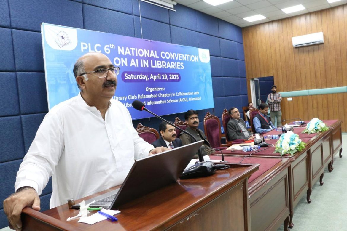 “پاکستان لائبریری کلب (اسلام آباد چیپٹر)، شعبہ لائبریری و انفارمیشن سائنس، اور ڈائریکٹوریٹ آف اسٹوڈنٹ ایڈوائزری اینڈ کونسلنگ سروسز، اے آئی او یو کے زیر اہتمام ‘پی ایل سی چھٹی قومی کنونشن برائے لائبریریوں میں مصنوعی ذہانت’ کی تصویری جھلکیاں۔”