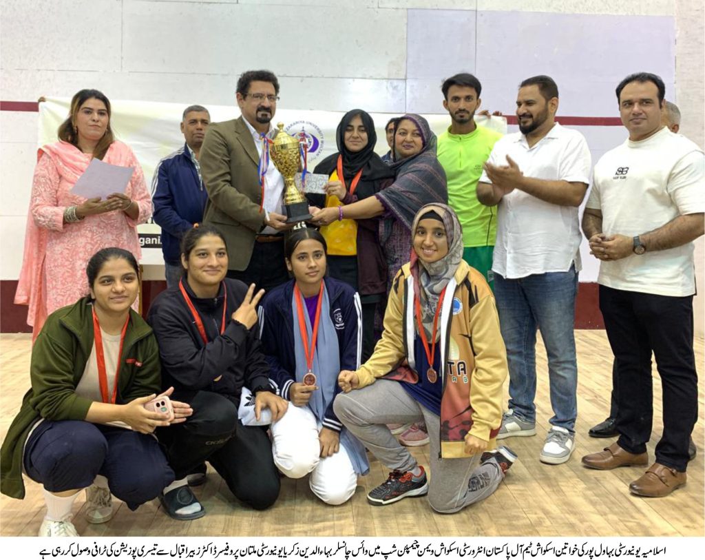 اسلامیہ یونیورسٹی آف بہاولپور کی خواتین اسکواش ٹیم نے بہاؤالدین ذکریا یونیورسٹی ملتان میں منعقد ہونے والی آل پاکستان انٹرورسٹی اسکواش ویمن چیمپئن شپ 2025-26 میں شرکت کی۔