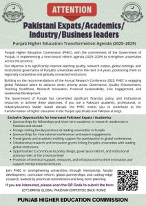 پنجاب ہائر ایجوکیشن کمیشن (PHEC) نے بیرونِ ملک مقیم پاکستانی ماہرین، ماہرِ تعلیم، صنعت اور کاروباری شعبے کے رہنماؤں کو صوبے کی جامعات کو مضبوط بنانے میں شمولیت کی دعوت دی ہے۔اس اقدام کے تحت جامعات میں مینٹورشپ، فیکلٹی ڈویلپمنٹ، نصاب میں اصلاحات، عالمی شراکت داریوں اور جدید تحقیق کے فروغ پر توجہ دی جا رہی ہے، جسے صوبائی سطح پر پختہ عزم اور طویل المدتی منصوبہ بندی کی حمایت حاصل ہے۔