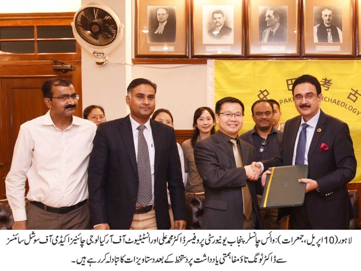 پنجاب یونیورسٹی شعبہ آرکیالوجی اور انسٹیٹیوٹ آف آرکیالوجی چائنیز اکیڈمی آف سوشل سائنسز نے”سی پیک: ون بیلٹ ون روڈ انیشیٹو“ کے سلسلے میں دوطرفہ تاریخی روابط کو فروغ دینے کے لیے مشترکہ سائنسی تحقیقی فیلڈ پراجیکٹس کے قیام پر اتفاق کرلیا۔ اس سلسلے میں مفاہمتی یادداشت پر دستخط کی تقریب وائس چانسلر پنجاب یونیورسٹی آفس کے کمیٹی روم میں منعقد ہوئی۔تقریب میں وائس چانسلر پروفیسر ڈاکٹر محمد علی، انسٹیٹیوٹ آف آرکیالوجی چائنیز اکیڈمی آف سوشل سائنسزکے سینئر ریسرچرزڈاکٹر ٹونگ تاؤ، ڈاکٹر لی سنچن، اسسٹنٹ ریسرچرز ڈاکٹر ائی وانکیاو، ڈاکٹر کوو جنگ، ریسرچر ڈاکٹر جیا ہوئی، ڈائریکٹر پنجاب آرکیالوجی محمد اقبال خان منج، پنجاب یونیورسٹی ڈائریکٹر ایکسٹرنل لنکجز ڈاکٹر یامینہ سلمان، چیئر مین شعبہ آرکیالوجی ڈاکٹر محمد حمید، اسسٹنٹ پروفیسر ڈاکٹر محمد عظیم ودیگرنے شرکت کی۔ معاہدے کے مطابق، دونوں ادارے دنیا کی دو قدیم تہذیبوں یعنی وادی سندھ کی تہذیب اور چینی تہذیب کے درمیان ممکنہ مقامات کی منظم اور سائنسی کھوج اور کھدائی کے ذریعے آثار قدیمہ اور تاریخی روابط کا سراغ لگانے پر کام کریں گے۔اس تعاون کے طویل مدتی مقاصد میں مقامات کا تحفظ، شعورکی بیداری اور ملک میں سیاحت کی ترقی کیلئے کام کرنا شامل ہے۔