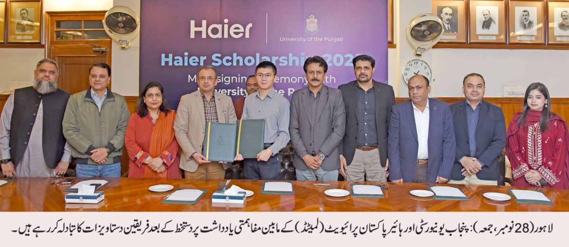 لاہور(28نومبر،جمعہ): پنجاب یونیورسٹی اور ہائیر پاکستان پرائیویٹ (لمیٹڈ)کے مابین مستحق طلبہ کو معیاری تعلیم تک بہتر رسائی فراہم کرنے کے لیے معاہدہ طے پاگیا۔ اس سلسلے میں مفاہمتی یادداشت پر دستخط کی تقریب وائس چانسلر آفس کے کمیٹی روم میں منعقد ہوئی جس میں رجسٹرار ڈاکٹر احمد اسلام،ڈائریکٹر پلاننگ اینڈ ڈیویلپمنٹ ڈاکٹر حافظ محمد انور اصغر، ڈائریکٹر ایکسٹرنل لنکجزڈاکٹر یامینہ سلمان، ہائیر پاکستان کی جانب سے چینی مینجمنٹ کے نمائندہ ژانگ، ڈائریکٹر مارکیٹنگ ہمائیوں بشیر و دیگر نے شرکت کی۔ معاہدے کے مطابق تقریباً 100 اسکالرشپس طلبہ کو میرٹ و ضرورت کی بنیاد پر فراہم کئے جائیں گے۔
