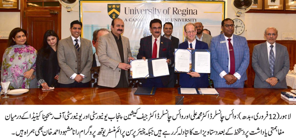 پنجاب یونیورسٹی اور یونیورسٹی آف ریجینا، کینیڈا کے درمیان تعلیمی و تحقیقی سرگرمیوں کو فروغ دینے کے لیے معاہدہ طے پاگیا۔ اس سلسلے میں مفاہمتی یاداشت پر دستخط کی تقریب وائس چانسلر پنجاب یونیورسٹی آفس کے کمیٹی روم میں منعقد ہوئی۔ اس موقع پر صدر اور وائس چانسلر یونیورسٹی آف ریجینا ڈاکٹر جیف کیشین، ایسوسی ایٹ وائس پریزیڈنٹ ہارون چوہدری، چیئرمین پرائم منسٹر یوتھ پروگرام رانا مشہود احمد خان، وائس چانسلر پروفیسر ڈاکٹر محمد علی، پرو وائس چانسلر پروفیسر ڈاکٹر خالد محمود، ڈائر یکٹر ایکسٹرنل لنکجز ڈاکٹر یامینہ سلمان، صدر آسا ڈاکٹر امجد مگسی و دیگر نے شرکت کی۔ وائس چانسلر پنجاب یونیورسٹی پروفیسر ڈاکٹر محمد علی اوروائس چانسلر یونیورسٹی آف ریجینا،کینیڈا ڈاکٹر جیف کیشین نے دونوں یونیورسٹیوں کے درمیان تعلیمی تعاون کو بڑھانے کی اہمیت پر زور دیا۔تقریب میں مفاہمت کی ایک یادداشت اورسٹوڈنٹ ایکسچینج پروگرام ایگریمنٹ پربھی دستخط کیے گئے جس میں فیکلٹی اور طلبہ وفودکے تبادلے کے پروگرام، مشترکہ تحقیق کیلئے اقدامات اور تعلیمی ترقی کے لیے مل کرکام کرنا شامل ہے۔ اس معاہدے سے بین الاقوامی تعلیمی تعلقات کو فروغ دینے،دونوں اداروں کے طلباء اور فیکلٹی ممبران کے لیے مواقع بڑھانے میں مددگار ثابت ہوگا۔