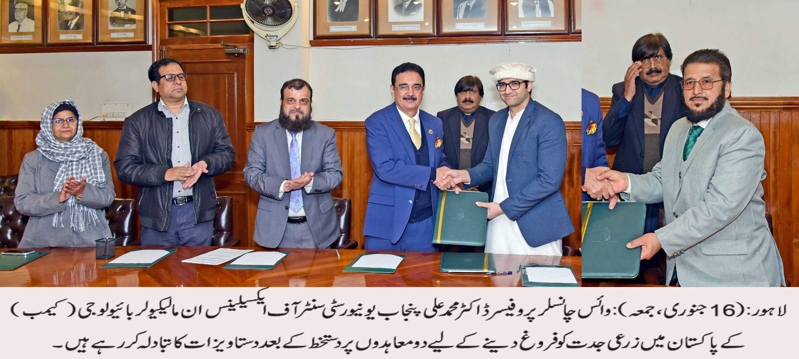 پنجاب یونیورسٹی سینٹر آف ایکسیلینس اِن مالیکیولر بائیولوجی (کیمب) لاہورنے پاکستان میں زرعی جدت کو فروغ دینے کے لیے تحقیق و ترقی کے دو اہم معاہدوں پر دستخط کیے۔ ان معاہدوں پر وائس چانسلر پروفیسر ڈاکٹر محمد علی نے دستخط کیے۔پہلا معاہدہ بہتر کپاس کی اقسام کی تیاری سے متعلق ہے، جو ڈاکٹر محمد ادریس خان، سیکریٹری پاکستان سینٹرل کاٹن کمیٹی، ہیڈکوارٹرز اور ڈاکٹر صباحت حسین، ڈائریکٹر سینٹرل کاٹن ریسرچ انسٹیٹیوٹ، ملتان کے ساتھ طے پایا۔ اس اشتراکِ عمل سے جدید تحقیق اور افزائشی حکمتِ عملیوں کے ذریعے کپاس کی پیداوار میں بہتری اور قومی کاٹن سیکٹر کو تقویت ملنے کی توقع ہے۔دوسرا معاہدہ ڈاکٹر جلال ادریس، سی ای او جین ٹیک لینڈز کے ساتھ طے پایا، جس کے تحت جدید حیاتیاتی تکنیکوں کو استعمال کرتے ہوئے بالخصوص کپاس اور مکئی کی ہائبرڈ فصلوں کی اقسام تیار کی جائیں گی۔اس موقع پرڈائریکٹر کیمب پروفیسر ڈاکٹر معاذ الرحمان، پروفیسر ڈاکٹر بشریٰ رشید، پروفیسر ڈاکٹر عبدالقیم راؤ، ڈاکٹر اللہ بخش اور مسٹر محمداعجاز نے شرکت کی۔ یہ معاہدے اکیڈیمیا اور صنعت کے مابین تعاون کے فروغ اور پاکستان میں پائیدار زرعی ترقی کی جانب اہم قدم ہیں۔