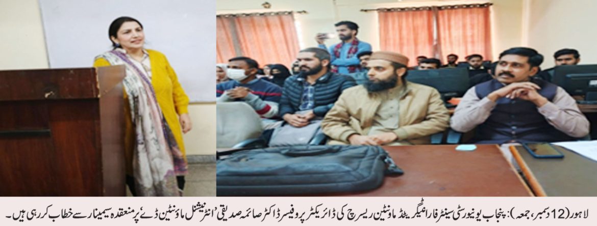 پنجاب یونیورسٹی سینٹر فار انٹیگریٹڈ ماونٹین ریسرچ کے زیر اہتمام انٹرنیشنل ماؤنٹین ڈے 2025ء کے سلسلے میں خصوصی سیمینار کا انعقاد کیا گیا۔ اس موقع پر ڈائریکٹر سنٹر پروفیسر ڈاکٹرصائمہ صدیقی، چیئرمین شعبہ جغرافیہ گورنمنٹ سائنس کالج ڈاکٹر محمد غوث، فیکلٹی ممبران اور طلباؤطالبات نے شرکت کی۔ اپنے خطاب میں ڈاکٹرصائمہ صدیقی نے معزز مہمانوں، مقررین اور شرکاء کو خوش آمدید کہا۔ انہوں نے اس دن کی اہمیت پر روشنی ڈالی اور عالمی تھیم ”گلیشیئرز پانی، خوراک اور روزگار کے لیے،پہاڑوں میں اور اس سے آگے“پر سیر حاصل بات چیت کی۔ انہوں نے ان گلیشیائی ماحولیاتی نظام کے تحفظ کی فوری ضرورت پر زور دیا جو لاکھوں انسانوں کی زندگیوں کا سہارا ہیں۔ڈاکٹر محمد غوث نے گلیشیئرز کے تیزی سے پگھلنے کی تشویشناک شرح اور اس کے میٹھے پانی کی دستیابی پر اثرات کے حوالے سے گفتگو کی۔ انہوں نے کہا کہ گلیشیئرپاکستان کی واٹر سکیورٹی کے لیے نہایت اہم ہیں اور موسمیاتی تبدیلی کے اثرات سے نمٹنے کے لیے مؤثر کلائمٹ مانیٹرنگ، واٹر شیڈ مینجمنٹ اور کمیونٹی انگیجمنٹ کو ضروری قرار دیا۔سول لائنز کالج کے ڈاکٹر محمد جبارنے خوراک کی پیداوار، توانائی کے حصول اور مقامی معاش کے لیے گلیشیئرز کے بنیادی کردار پر روشنی ڈالی۔ انہوں نے کہا کہ پہاڑی علاقوں سے لے کر زیریں مقامات تک کروڑوں لوگ گلیشیئرکے پگھلے پانی پر زرعی ضروریات، پینے کے پانی اور ہائیڈرو پاور کے لیے انحصار کرتے ہیں۔
