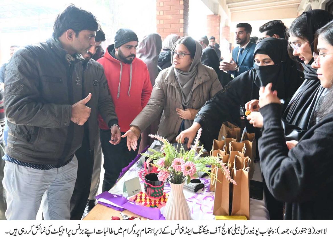 :پنجاب یونیورسٹی ہیلی کالج آف بینکنگ اینڈ فنانس کے زیر اہتمام بزنس مینجمنٹ پروگرام کے کامیاب سمسٹر کی تکمیل کے سلسلے میں طلباء کی طرف سے پیش کیے گئے فائنل ٹرم کے جدید پراجیکٹس کی نمائش کا انعقاد کیا گیا۔تقریب کے انعقاد کا مقصد طلباء میں تخلیقی سوچ، کاروباری جذبے اور عملی مہارت کو تقویت فراہم کرنا ہے۔ تقریب میں نئے کاروباری آئیڈیاز، پراڈکٹس اور خدمات کی نمائش کی گئی،جس نے طلباء کی سوچ اور حقیقی دنیا کے چیلنجوں سے نمٹنے کی صلاحیت کو ظاہرکیا۔اپنے خطاب میں پرنسپل ہیلی کالج آف بینکنگ اینڈ فنانس ڈاکٹر احمد منیب مہتا کا کہنا تھا کہ وہ طلباء کے جدید پراجیکٹس کو دیکھ کر بہت پرجوش ہیں، جو واقعی وقت کی ضرورت ہے۔ انہوں نے مزید کہا کہ یہ منصوبے نہ صرف ہمارے طلباء کی تخلیقی صلاحیتوں اور کاروباری جذبے کو ظاہر کرتے ہیں بلکہ ایک جامع تعلیم فراہم کرنے کے لیے کالج کے عزم کو بھی اجاگر کرتے ہیں جو طلباء کو 21ویں صدی کے چیلنجوں کے لیے تیار کرتی ہے۔ انہوں نے کہا کہ وائس چانسلر پنجاب یونیورسٹی ڈاکٹر محمد علی کے ویژن کے مطابق، پائیداری پر ہماری توجہ صرف تھیوری پر نہیں ہے، یہ عملی اطلاق اور اپنے طلباء کو مثبت اثر ڈالنے کے لیے بااختیار بنانے کے بارے میں ہے۔ انہوں نے کہا کہ کالج انٹرپرینیورشپ اور پائیداری میں اپنے اقدامات کو جاری رکھنے اور بڑھانے کا ارادہ رکھتا ہے۔