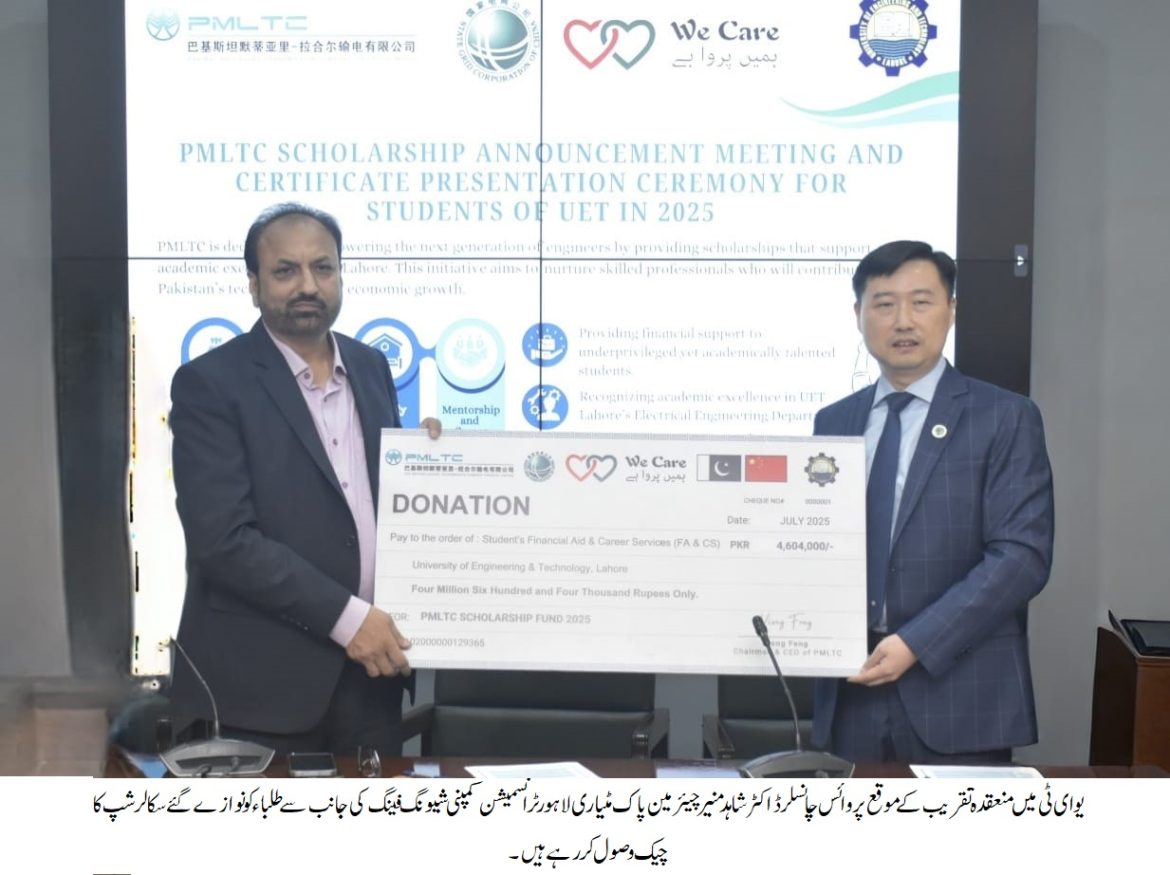 پاک مٹیاری لاہور ٹرانسمیشن کمپنی پرائیویٹ لمیٹڈ (پی ایم ایل ٹی سی) نے یو ای ٹی لاہور کے 10 الیکٹریکل انجینئرز کو اسکالرشپس سے نوازا۔ اس سلسلے میں سکالرشپ کے چیک تقسیم کرنے کیلئے یونیورسٹی میں تقریب کا انعقاد کیا گیا۔ تقریب میں وائس چانسلر ڈاکٹر شاہد منیر، پی ایم ایل ٹی سی کے چیئرمین / سی ای او شیونگ فینگ نے خصوصی شرکت کی۔ ڈاکٹر شاہد منیر نے چینی وفد کو خوش آمدید کہا اور طلباء کی تعلیمی معاونت پر ان کا شکریہ ادا کیا۔ انہوں نے اپنے خطاب میں کہا کہ ”یہ اقدام نہ صرف صنعت و جامعہ کے درمیان روابط کو مضبوط کرتا ہے بلکہ پاکستان اور چین کی بڑھتی ہوئی دوستی کا بھی مظہر ہے۔”