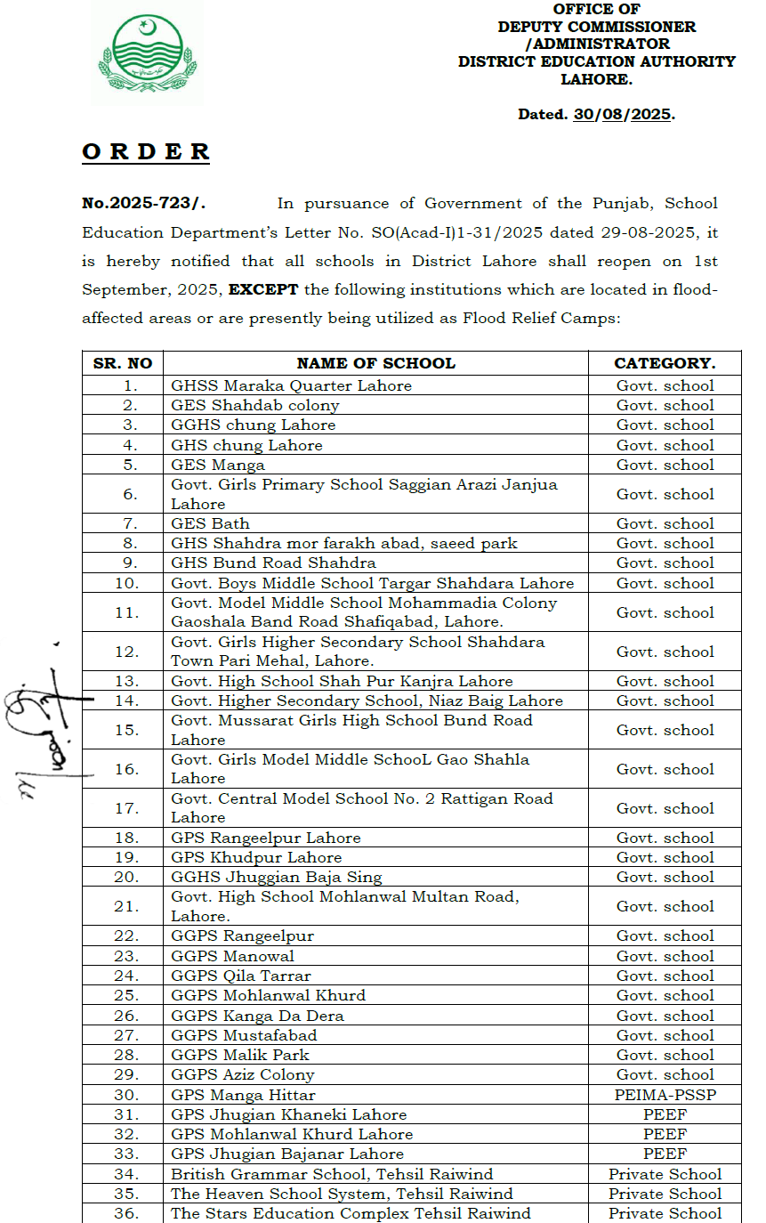 Schools Closure in District Lahore due to Flood ڈپٹی کمشنر لاہور کے جاری کردہ نوٹیفکیشن کے مطابق سیلاب زدہ علاقوں میں واقعہ 45 سکولوں کے علاوہ ضلع لاہور کے تمام سکول یکم ستمبر 2025 سے کھل گئۓ ہیں۔۔۔۔۔۔۔۔۔ان 45 سکولوں میں سیلاب متاثرین کے لیے فلڈ ریلیف کیمپس کھولے گئے ہیں ۔