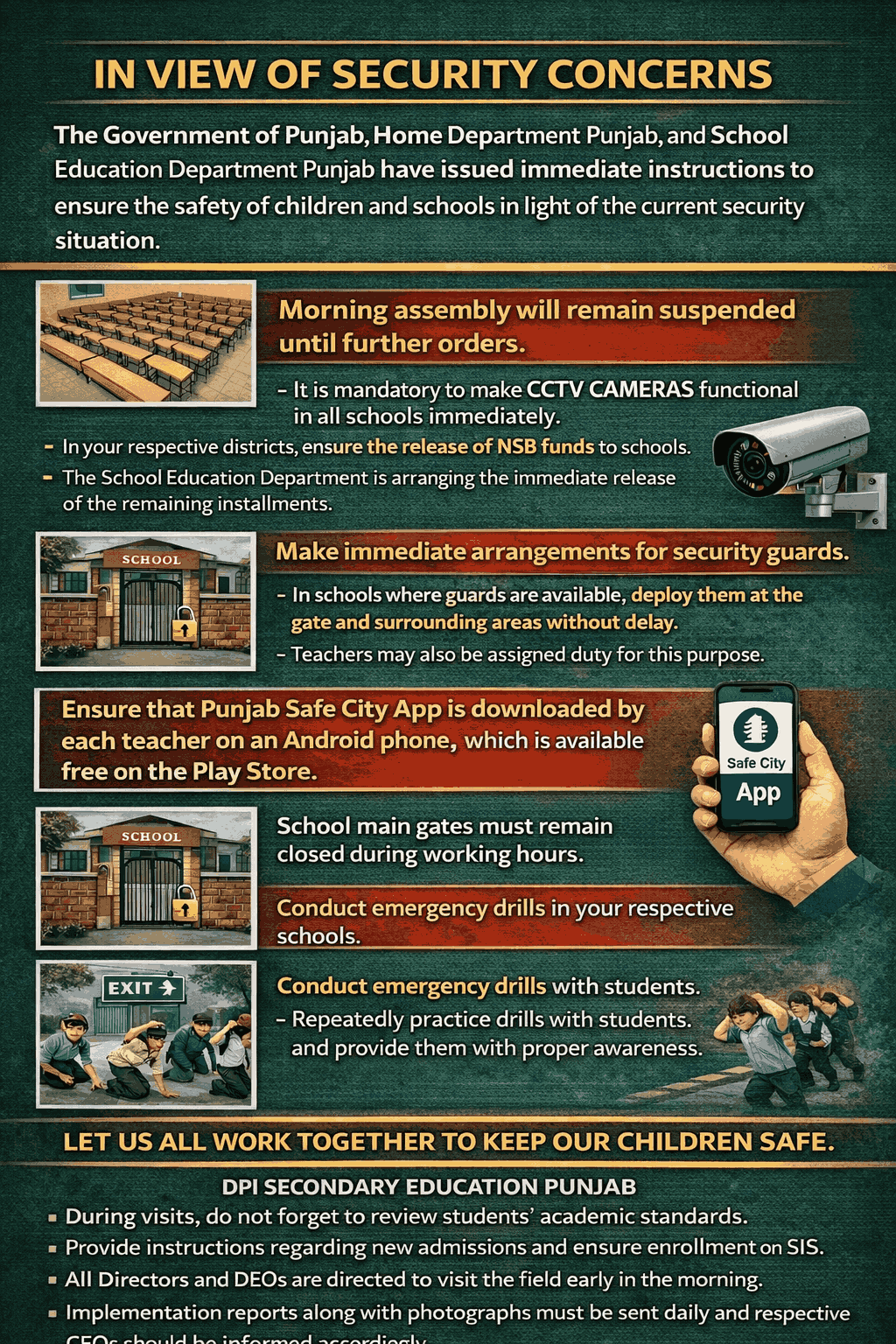 ڈی پی آئی سیکنڈری ایجوکیشن سکولز پنجاب کے جاری کردہ ڈویژنل ڈائریکٹرز ، ڈی ای او سیکنڈری ایجوکیشن DEAs، تمام سربراہان ادارہ ھائی و ھائر سیکنڈری سکولز پنجاب کے نام مراسلہ کے مطابق۔ سیکورٹی خدشات پیش نظر کے پیش نظر حکومت پنجاب ،محکمہ داخلہ پنجاب اور سکول ایجوکیشن ڈیپارٹمنٹ پنجاب نے بچوں اور سکولز کی حفاظت کے لیے فوری اقدامات کی ھدایت کی ھے ۔ یہ درج ذیل ھیں ۔