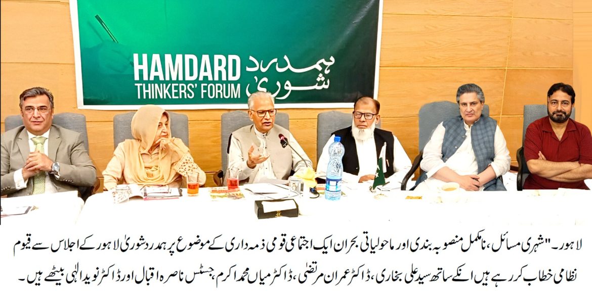 دوسرا سیوریج سسٹم ناقص ہے جو آبادی کی ضرورت کے مطابق نکاسی آب کا بوجھ برداشت کرنے سے قاصر ہے اسی وجہ سے بارش کے دنوں میں نکاسی آب کے مسائل شدت اختیار کر جاتے ہیں اور ایک بڑی وجہ دیہی علاقوں میں سہولتوں کا فقدان ہے جس کے باعث شہروں میں آبادی کا بوجھ بڑھ رہا ہے۔ ہمیں ان سب چیزوں کو مدنظر رکھ کر مستقبل کی منصوبہ بندی کرنی ہو گی، اس سلسلے میں اجتماعی رہائش گاہیں بنانے کی طرف توجہ دینا ہو گی۔ معیاری اور پبلک ٹرانسپورٹ بڑھانی ہو گی تاکہ کاربن کا اخراج کم سے کم کیا جائے، شجرکاری کے حوالے سے آگاہی مہم چلائی جائے۔میں سمجھتا ہوں کہ حکومت جو پالیسی منظور کرنے جا رہی ہے، اسے مشتہر کر کے عوامی تجاویز حاصل کی جائیں تاکہ پالیسی میں کوئی سقم باقی نہ رہے۔ڈپٹی اسپیکر جناب قیوم نظامی نے اپنے خطاب میں ہمدرد فاؤنڈیشن کو خراجِ تحسین پیش کرتے ہوئے کہا کہ یہ ادارہ شہیدِ پاکستان، حکیم محمد سعید کی روایات کو زندہ رکھتے ہوئے ملک بھر میں ہر ماہ فکری نشستوں کا تسلسل برقرار رکھے ہوئے ہے۔انہوں نے کہا کہ آج ہم ایک ایسے دور سے گزر رہے ہیں جہاں شہروں کی وسعت بڑھ رہی ہے، مگر معیارِ زندگی تنزلی کا شکار ہے۔ ماحولیاتی آلودگی، پانی و صفائی کے مسائل، بڑھتی ہوئی کچی آبادیاں، ٹریفک کا دباؤ، غیر منصوبہ بند تعمیرات اور تجاوزات — یہ سب ناقص منصوبہ بندی اور بیڈ گورننس کا شاخسانہ ہیں۔ان کا کہنا تھا کہ سرکاری اسکیمیں اکثر اشرافیہ کے مفادات کی نذر ہو جاتی ہیں، جب کہ عام شہری نہ تو سستی رہائش حاصل کر پاتا ہے، نہ صاف پانی، معیاری تعلیم اور صحت کی بنیادی سہولیات۔