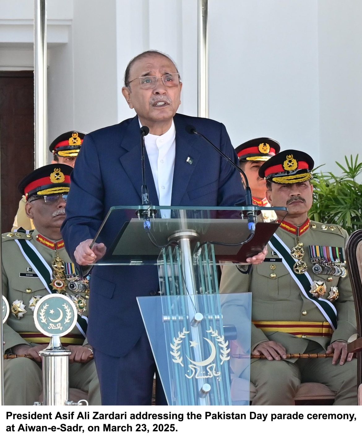 صدر آصف علی زرداری نے یوم پاکستان کی تقریب کے شرکا کو مبارکباد دیتے ہوئے اپنے خطاب میں کہا کہ آج کے دن لاکھوں مسلمانوں کی قربانیوں کی یاد تازہ کرتے ہیں، لاکھوں قربانیوں کی بدولت پاکستان کاخواب حقیقت میں بدلا، شہدا کی قربانیوں کو خراج تحسین پیش کرتے ہیں، ہم نے بہت سی قربانیاں دے کر آزادی حاصل کی۔