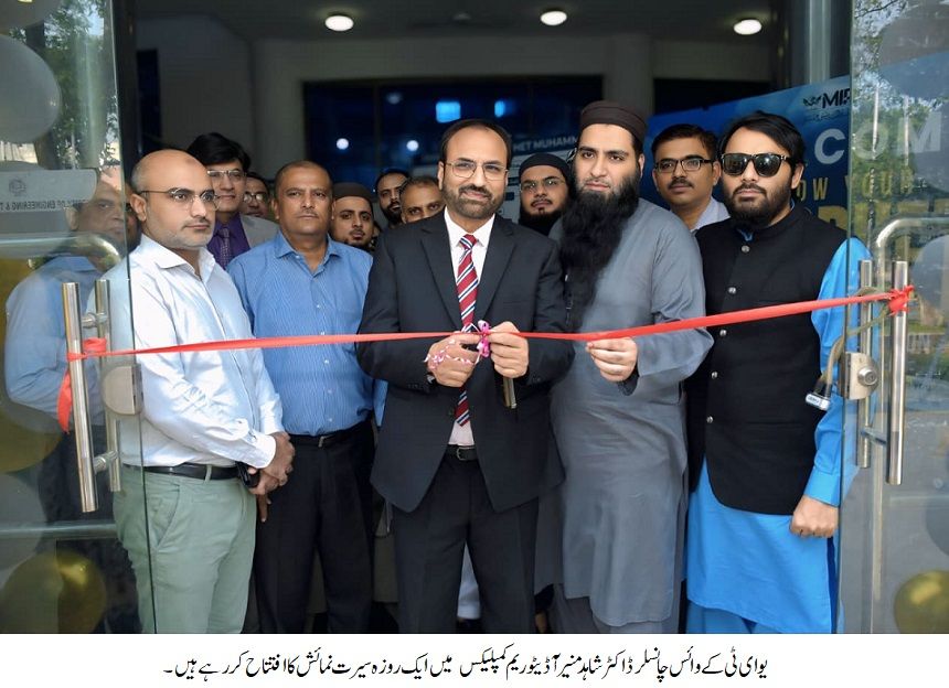 یونیورسٹی آف انجینئرنگ اینڈ ٹیکنالوجی لاہور میں پہلی بار سیرت طیبہ ﷺ پر عظیم الشان نمائش کا انعقاد کیا گیا۔ نمائش کا اہتمام المدینہ اسلامک ریسرچ سنٹر نے انکویزیٹرز کوئز سوسائٹی کے تعاون سے کیا۔ تقریب کے مہمانِ خصوصی وائس چانسلر یو ای ٹی پروفیسر ڈاکٹر شاہد منیر تھے جنہوں نے ربن کاٹ کر اس تاریخی نمائش کا باقاعدہ افتتاح کیا۔ نمائش میں پوسٹر گیلری، سیرةﷺ ماڈلز، ورچوئل ریئلٹی، انٹرایکٹو تھری ڈی ویوز، سکالرز کی جانب سے علمی وضاحتیں اور طلباء کے لیے کوئزز و سرٹیفکیٹس شامل تھے۔ وائس چانسلر ڈاکٹر شاہد منیر نے شرکاء سے خطاب کرتے ہوئے کہا کہ یہ نمائش طلباء کو سیرتِ نبوی ﷺ سے روشناس کروانے کا ایک انوکھا اور جدید انداز ہے۔ سیرتِ رسول ﷺ کو جاننا اور اس پر عمل کرنا ہمارے کردار سازی کا بنیادی ستون ہے۔ اسوہ رسول ﷺ کا ہر گوشہ ہمارے لئے مشعل راہ ہے۔ یونیورسٹی میں اس نوعیت کی سرگرمیاں نہ صرف طلباء کے علم میں اضافہ کرتی ہیں بلکہ ان میں دین اور آقا دو جہاں ﷺ سے محبت کو بھی اجاگر کرتی ہیں۔ انہوں نے مزید کہا کہ نوجوانوں کو اسوہ حسنہ ﷺ پر عمل کرنا چاہیے اور بعثت نبوی ﷺ کے مقاصد پر غور کرنا چاہیے۔ سیرت منانے کا نہیں اپنانے اور عمل کرنے کا تقاضا کرتی ہے۔ نمائش میں رجسٹرار، ڈینز، مختلف تدریسی و انتظامی شعبہ جات کے سربراہان اور فیکلٹی ممبران نے اپنی فیملیز کے ہمراہ شرکت کی۔ وائس چانسلر نے اس نمائش کے انعقاد پر المدینہ اسلامک ریسرچ سینٹر کا شکریہ ادا کیا۔