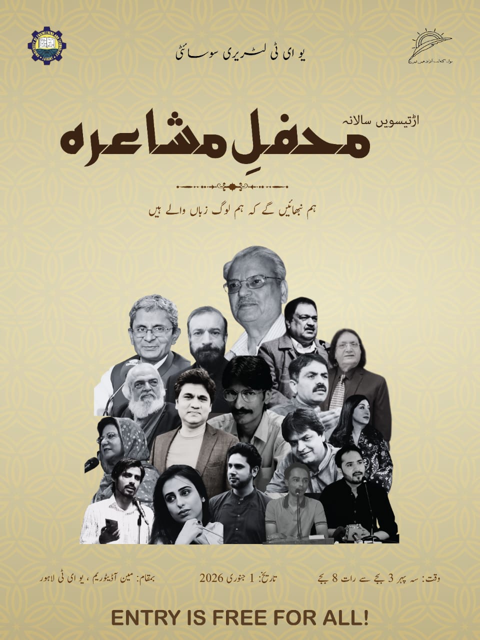 ردو ادب اور شاعری کے فروغ کے لیے 38ویں سالانہ محفلِ مشاعرہ کا انعقاد جمعرات، یکم جنوری 2026ء کو دوپہر 3 بجے کیا جائے گا۔ اس ادبی تقریب کی میزبانی یونیورسٹی آف انجینئرنگ اینڈ ٹیکنالوجی (UET) کے مین آڈیٹوریم کمپلیکس میں کی جائے گی۔محفلِ مشاعرہ میں نامور شعراء اور ادب سے وابستہ شخصیات کی شرکت متوقع ہے، جہاں سامعین کو اعلیٰ درجے کی شاعری سننے کا موقع ملے گا۔ منتظمین کے مطابق یہ سالانہ مشاعرہ ادبی روایت کو زندہ رکھنے اور نئی نسل میں شعری ذوق اجاگر کرنے کی ایک اہم کڑی ہے۔