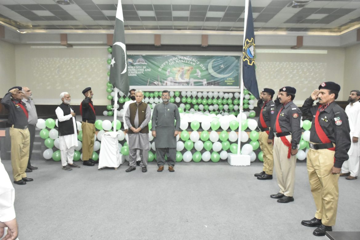 یونیورسٹی آف انجینئرنگ اینڈ ٹیکنالوجی لاہور میں 77ویں یوم آزادی کی مناسبت سے پرچم کشائی کی رنگا رنگ تقریب کا انعقاد کیا گیا۔ کیمپس کو برقی قمقموں اور جھنڈوں سے سجایا گیا نیز ملی نغمے بھی پیش کیے گئے۔ وائس چانسلر یو ای ٹی پروفیسر ڈاکٹر ناصر حیات نے بطور مہمان خصوصی شر کت کی اور قومی پرچم لہرا کر تقریب کا باقاعدہ آغاز کیا۔ چاک و چوبند گارڈز نے سلامی پیش کی۔ تقریب میں ڈینز، چیئرپرسنز، رجسٹرار، دائریکٹر ککس، ڈی ایس اے،کنٹرولر امتحانات، پی آر او، دیگر تعلیمی و انتظامی عملے اور طلباء کی کثیر تعداد نے شرکت کی۔ جشن آزادی کے اس پر مسرت موقع پر فیملیز بالخصوص بچوں کا جوش و خروش دیدنی تھا۔ تقریب کے اختتام پرڈی ایس اے آفس کی جانب سے منعقد ہونے والے اردو اور انگریزی مضمون نویسی اور ذہنی آزمائش کے مقابلہ جات میں پہلی اور دوسری پوزیشن حاصل کرنے والے طلباوطالبات میں اسناد تقسیم کی گئیں۔ جشن آزادی کی مناسبت سے کیک کاٹا گیا پودے بھی لگائے گئے نیزملک میں امن و امان اور خوشحالی کیلئے خصوصی دعا کی گئی۔