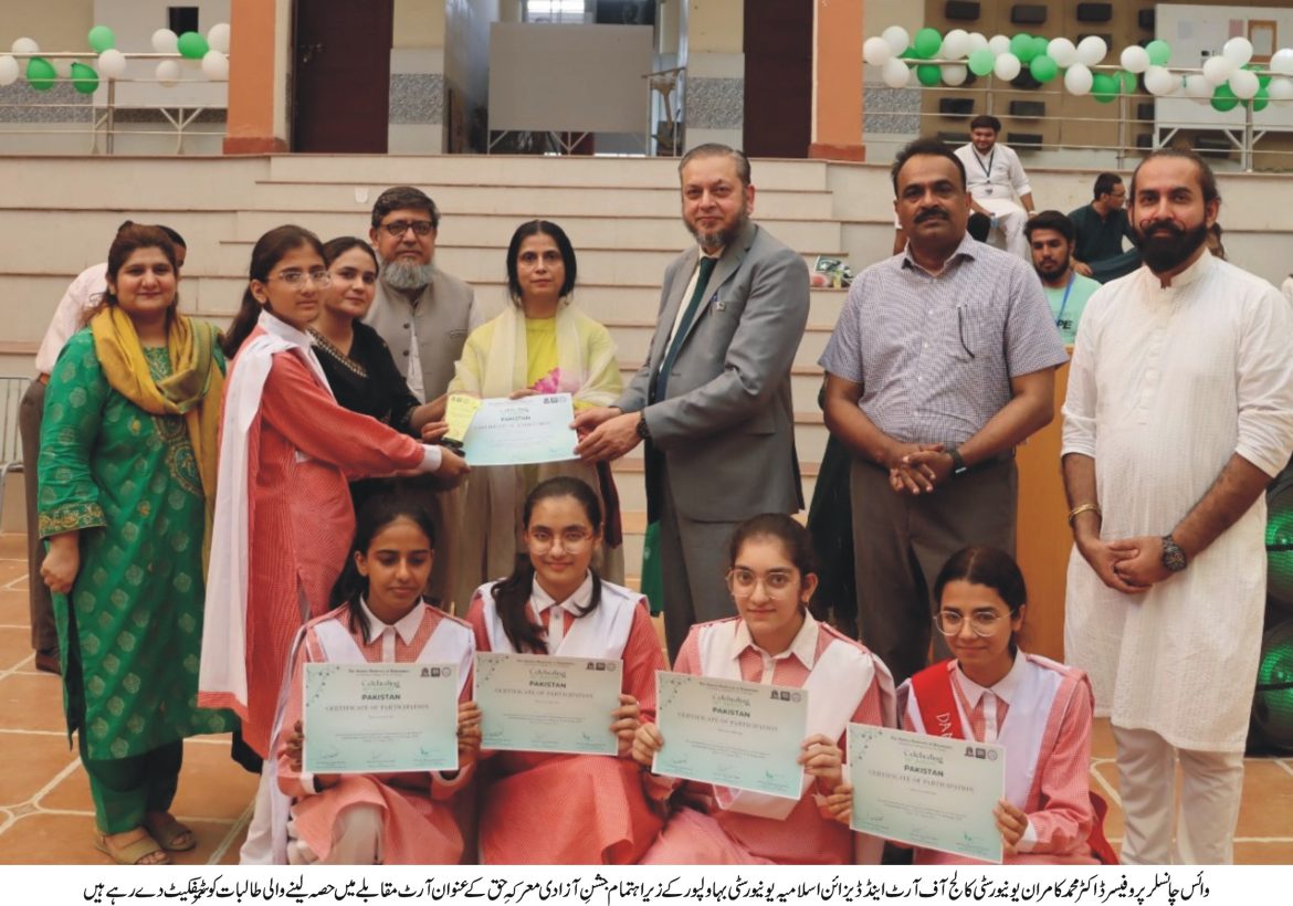 یونیورسٹی کالج آف آرٹ اینڈ ڈیزائن اسلامیہ یونیورسٹی بہاولپور میں جشنِ آزادی معرکہِ حق کے عنوان سے پاکستان کا 78 واں یوم آزادی منایا گیا۔ وائس چانسلر پروفیسر ڈاکٹر محمد کامران اس موقع پر مہمان خصوصی تھے۔ پرنسپل ڈاکٹر فرحانہ الطاف قریشی نے پرعزم طلباءوطالبات اور فیکلٹی ممبران کے ساتھ جشن آزادی کے جذبے کو پروان چڑھانے کے لیے آرٹ مقابلے، آرٹ نمائش اور دلکش پرفارمنس کے پروگرام ترتیب دیئے ۔ جشن آزادی آرٹ مقابلے میں جنوبی پنجاب کے 15 اسکولوں سے ایک سو طلباءوطالبات شریک ہوئے ۔ ڈین فیکلٹی آف آرٹس اینڈ لینگویجز پروفیسر ڈاکٹر سید عامر سہیل، ڈین فیکلٹی آف مینجمنٹ سائنسز اینڈ کامرس پروفیسر ڈاکٹر جواد اقبال، پرنسپل دانش سکول حاصل پور شہلا فرحان، ڈاکٹر ثمر فہد، ڈاکٹر نوین جاوید، ڈاکٹر شہباز علی خان اور دیگر فیکلٹی ممبران بھی موجود تھے ۔