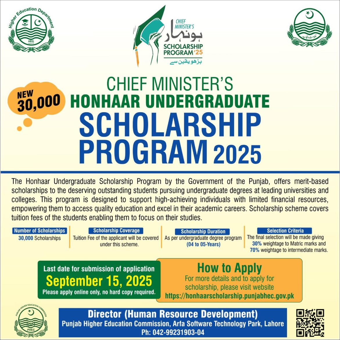 HONHAAR SCHLORSHIP 2025………….پنجاب میں ہونہار طلباء کے لیے 30,000 انڈرگریجویٹ اسکالرشپس کے لئے درخواستیں طلب ۔۔۔۔۔۔۔۔۔۔پروگرام کے تحت پنجاب بھر میں انڈرگریجویٹ ڈگری حاصل کرنے والے 30,000 سے زائد طلباء کو اسکالرشپس دی جائیں گی۔